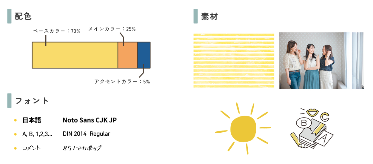 「明るくポップで楽しい雰囲気」を演出できそうな写真素材・イラスト・フォントを選定しました。