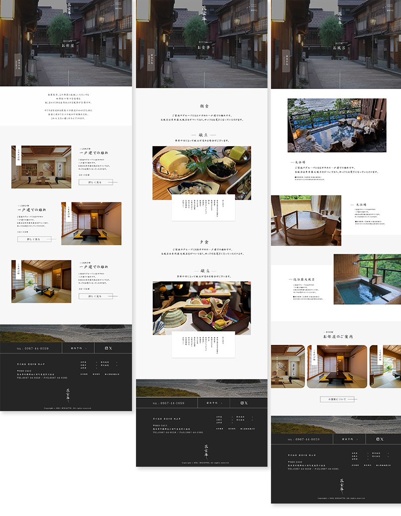 メインビジュアルをファーストビューいっぱいに画像を置くことで、旅館全体の雰囲気を感じられるようにしました。また、宿泊予約のボタンについては、スマホサイトでは操作性を考え右下にボタンを配置しております。全体のレイアウトはシンプルにしつつ、画像を大きく見せることでインパクトもあり、幅広い世代にとって見やすい設計・デザインにしました。