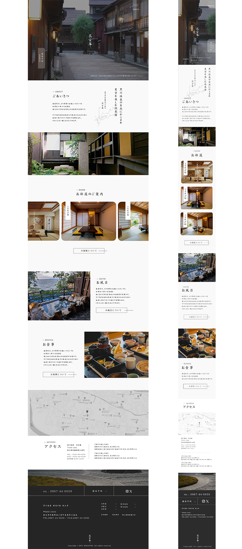 熊本・阿蘇の温泉地黒川温泉にあり、山や川に囲まれた自然豊かな風景が自慢の旅館『花玄庵』のWEBサイトのリニューアル提案を企画~サイト制作までさせて頂きました。