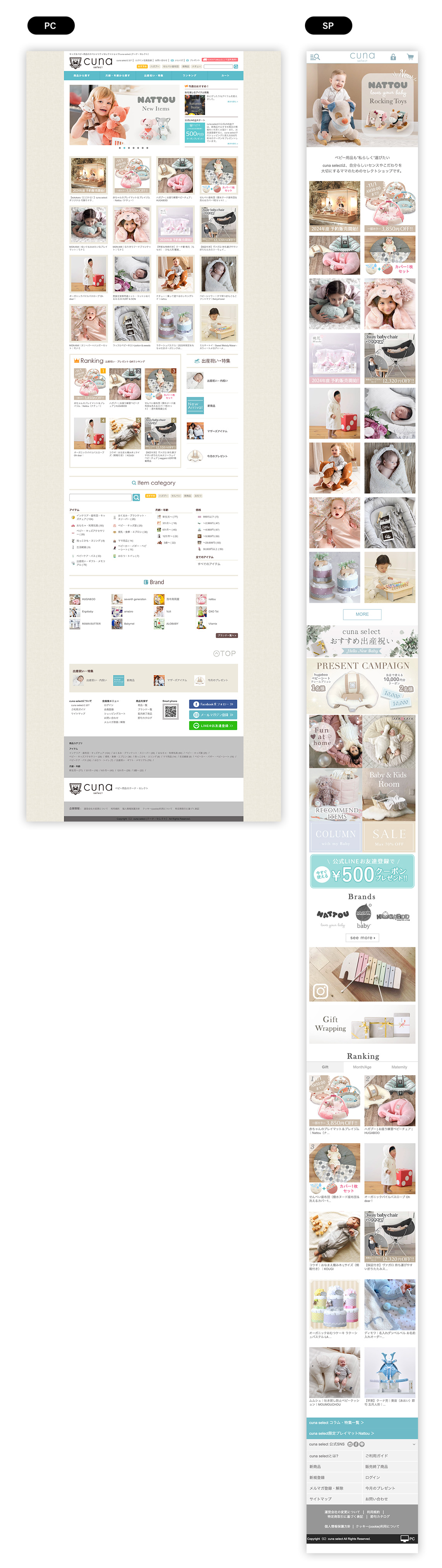 ベビー用品ECサイト「cuna select」WEBサイト massa Web & APP & LPデザイナー OVERVIEW サイトデザインなど、画像制作業務全般を担当しました。 温かい色味をベースにアナリティクスを解析し、使いやすさを考えたUIにデザインリニューアルしました。1年半で売上げ 200万円/月⇒1600万円/月に向上。制作したデザイン