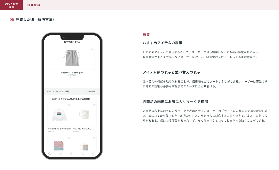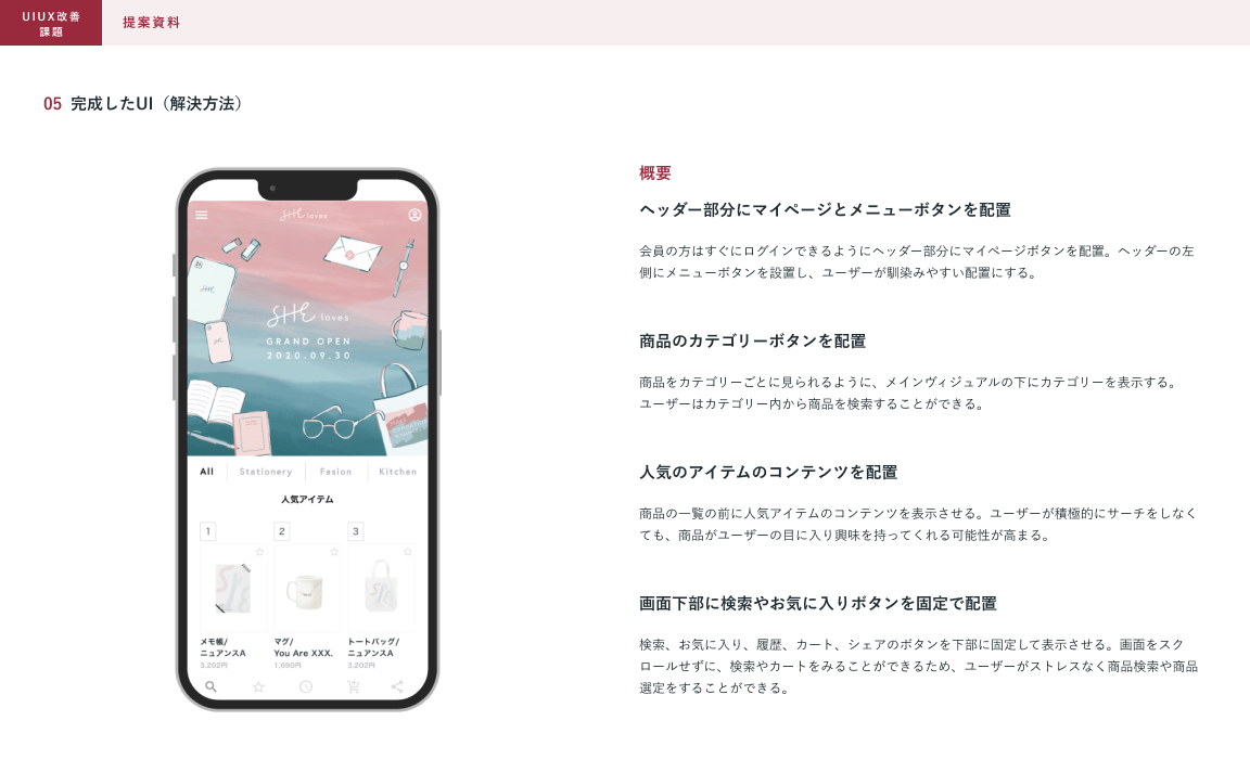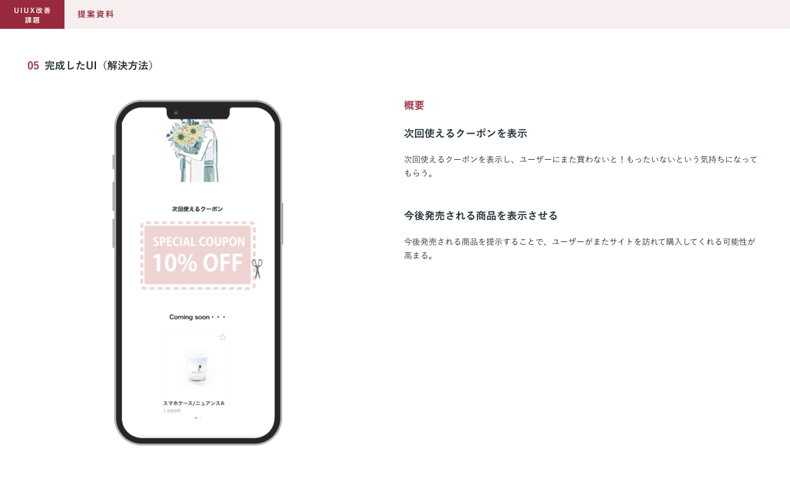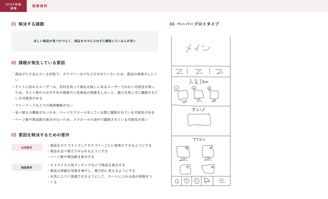 UI/UX改善提案課題に取り組みました。ペーパープロトタイプ、Figmaを使用したデザインカンプ、改善提案資料を作成しました。
