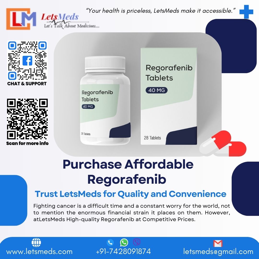 Regorafenib is a targeted therapy that is used for advanced colorectal cancer, gastrointestinal stromal tumors (GIST), and hepatocellular carcinoma (HCC). The most important thing to highlight about the drug is that it stops the cancerous cells therefore, it is a crucial treatment path. Nevertheless, the regorafenib price in the Philippines is usually high. LetsMeds step in and ensure the patients get regorafenib 40 mg at low rates due to patients always staying on point with their recovery process rather than on the costs.