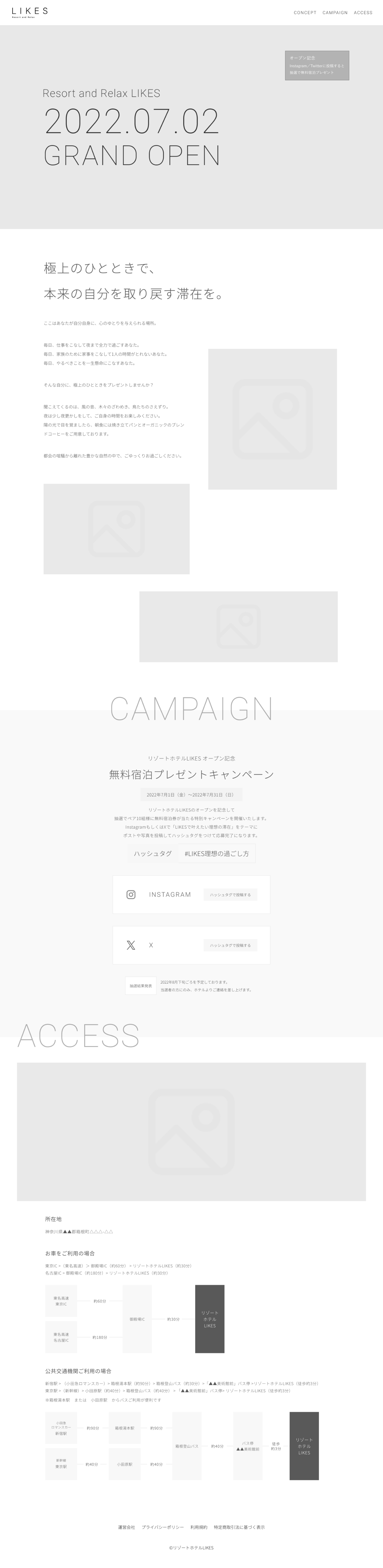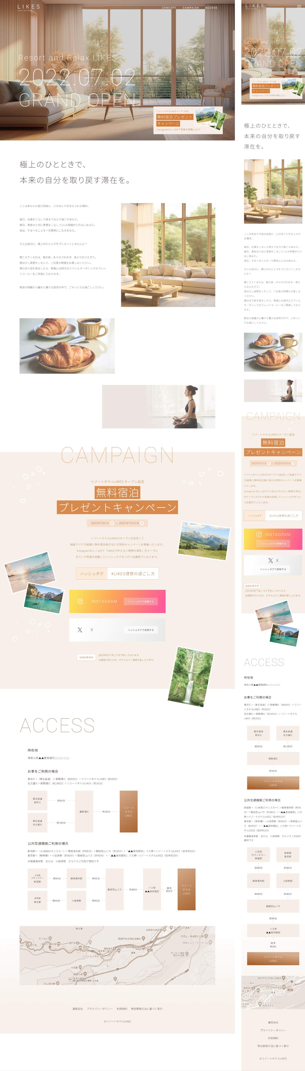 架空ホテル「リゾートホテルLIKES」の新規オープンキャンペーンのLPを制作。