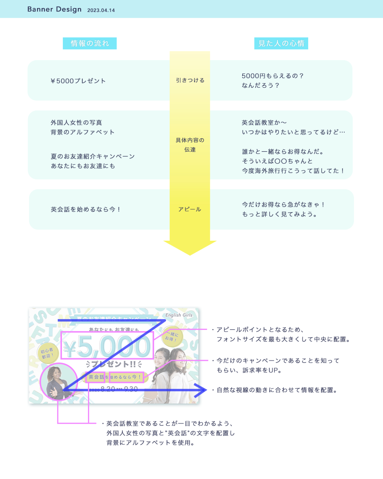 制作にあたり、まず最初に情報の優先付けやグルーピングを行うことで伝えたいことが明確になり、デザインへの落とし込みもスムーズになるということを学びました。
