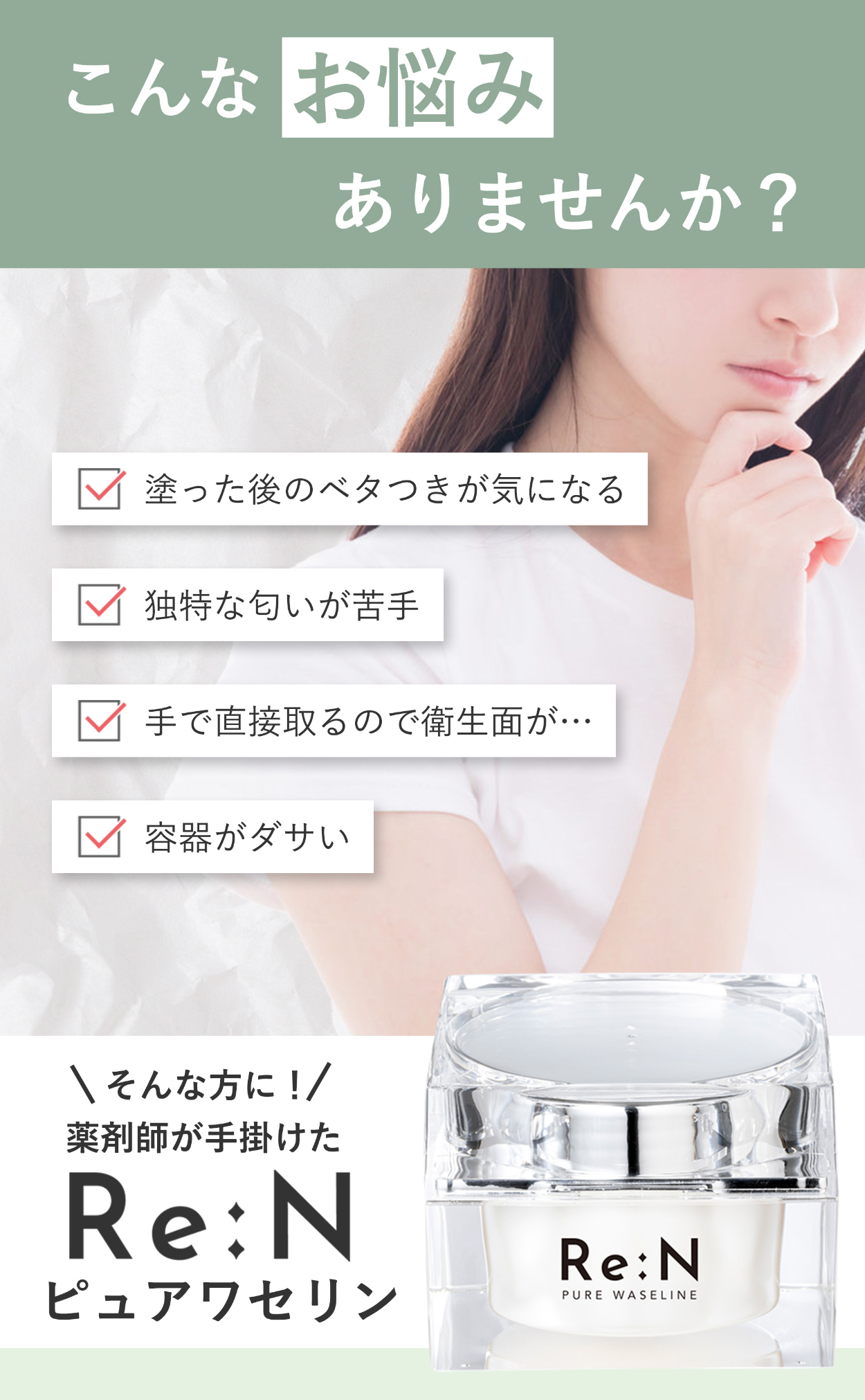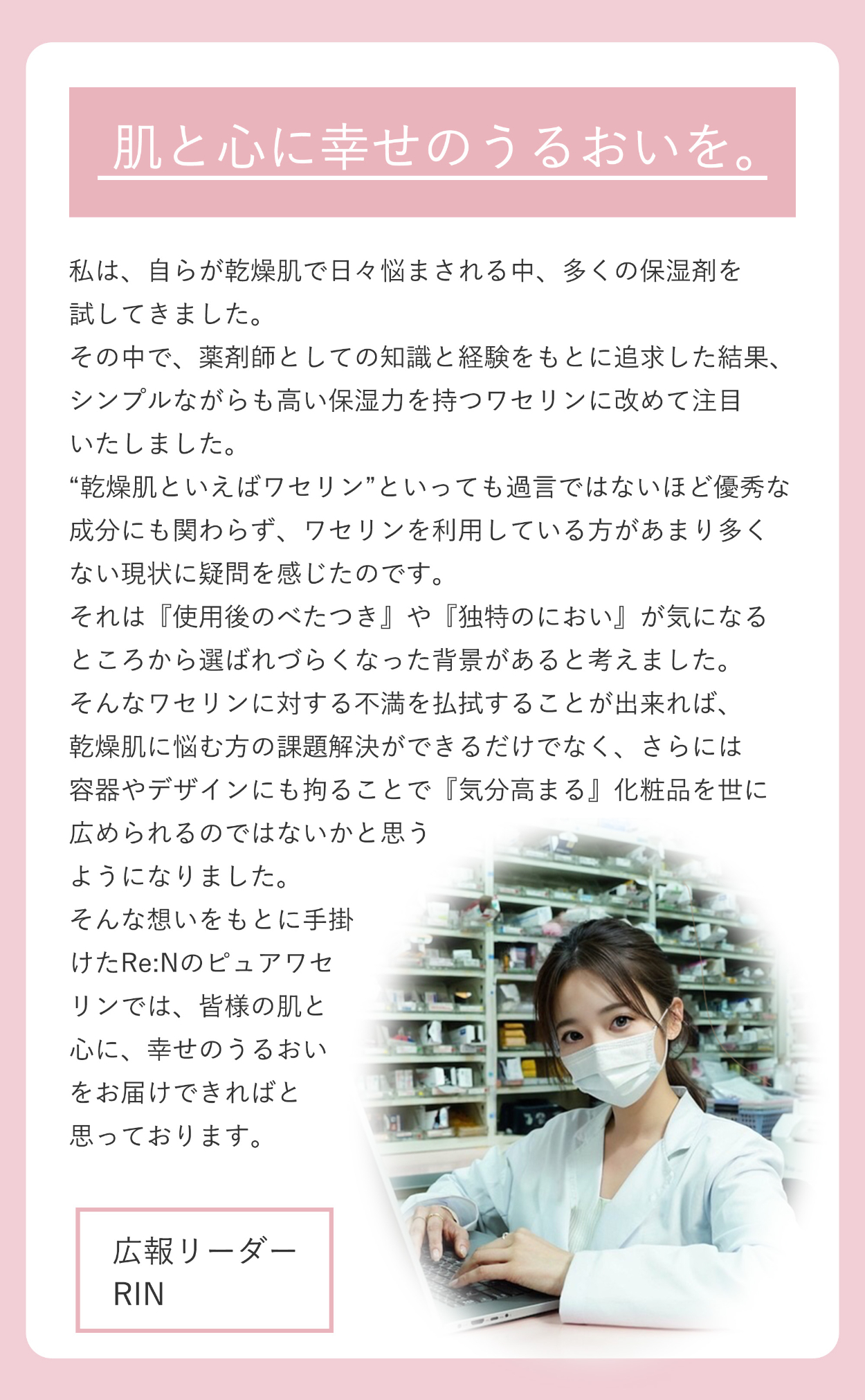 Amazon商品ページ あかね webデザイナー OVERVIEW Re:NピュアワセリンのAmazon商品ページを作成しました。 ピンクを基調にすることで女性・ママさん向けに親しみやすく、グリーンや背景の植物・水面でピュアワセリンの無駄なものが入っていない純粋でナチュラルさをイメージしました。