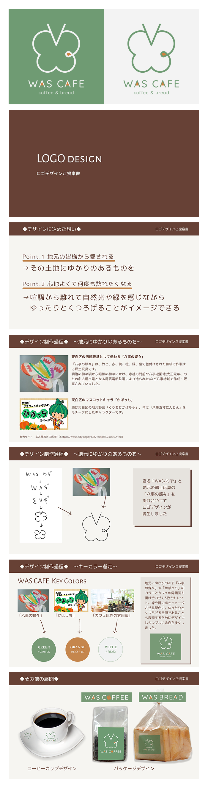 出店地域の天白区の郷土玩具「八事の蝶々」から着想。店名である「WAS /わず」と掛け合わせて蝶々をモチーフにしたデザインを考案しました。
