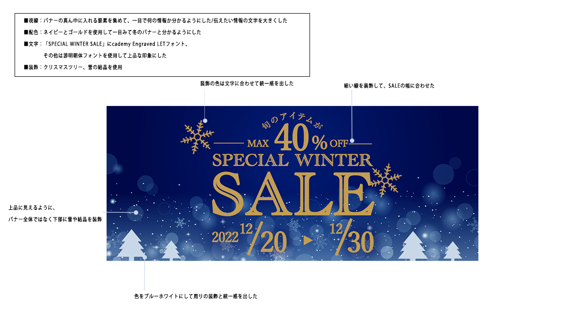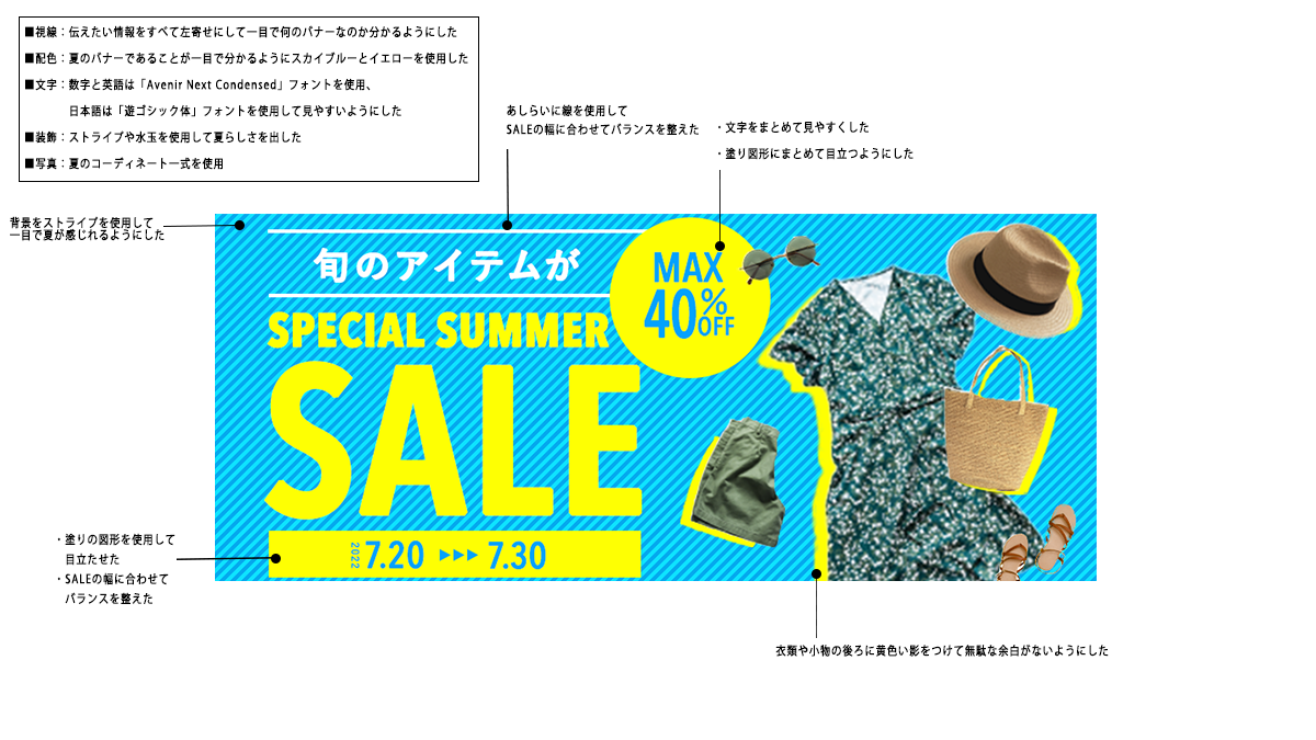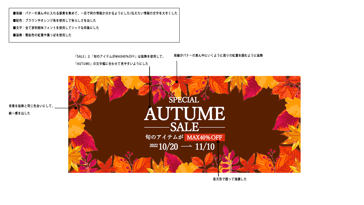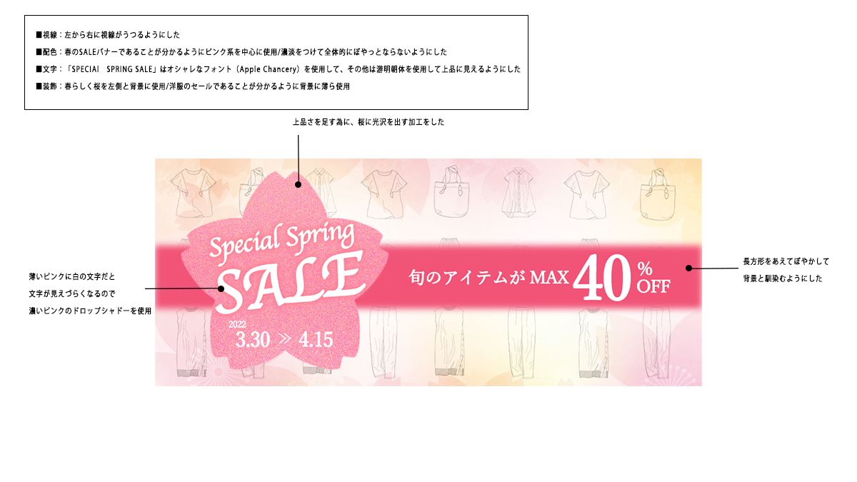 【架空】バナー制作/セールバナー 和知 真子 WEBデザイナー 📝要件【依頼内容】20代後半〜30代女性各季節ごとのセールをお知らせをする【入れる文字要素】SPECIAl ●●●(季節)SALE旬のアイテムがMAX40%OFF開催期間:2022〜✏️制作したバナー✏️課題を通して学んだこと一目で季節感が分かるような配色や装飾を選びました。入れる文字要素が多かったため、見えづらくならないように文字と装飾のバランスを考えて配置しました。