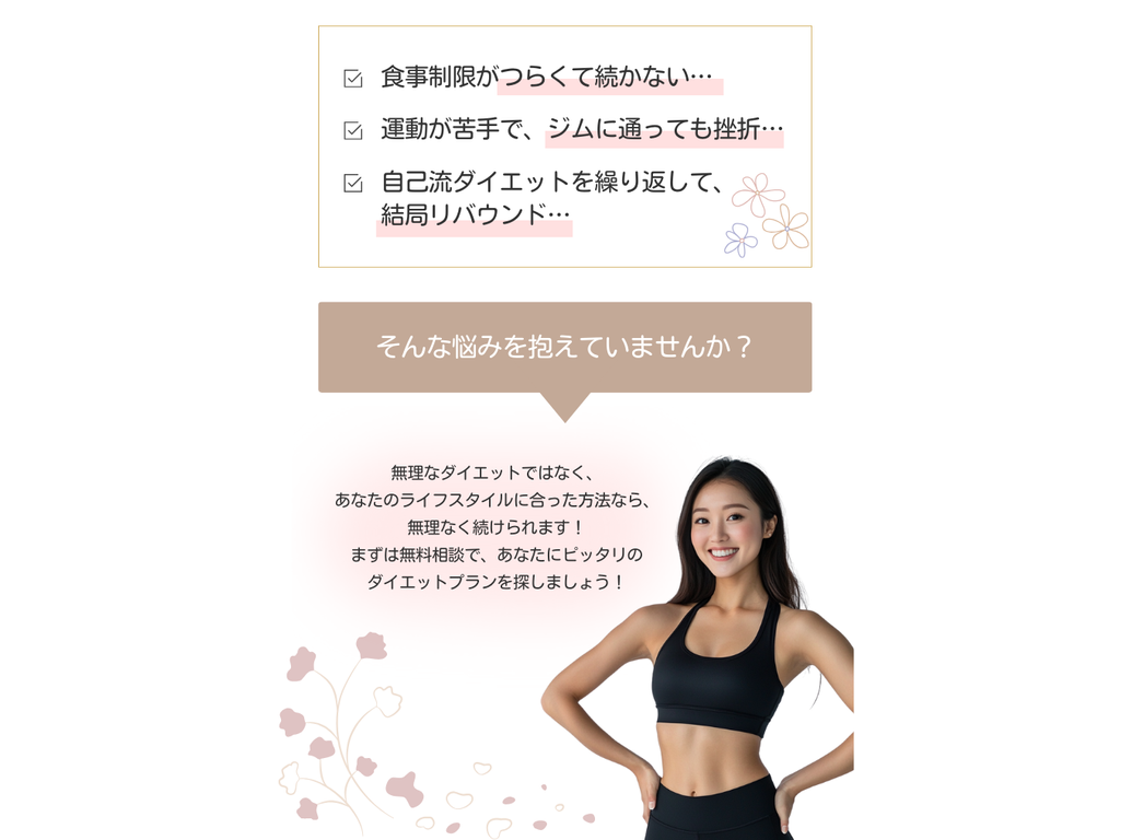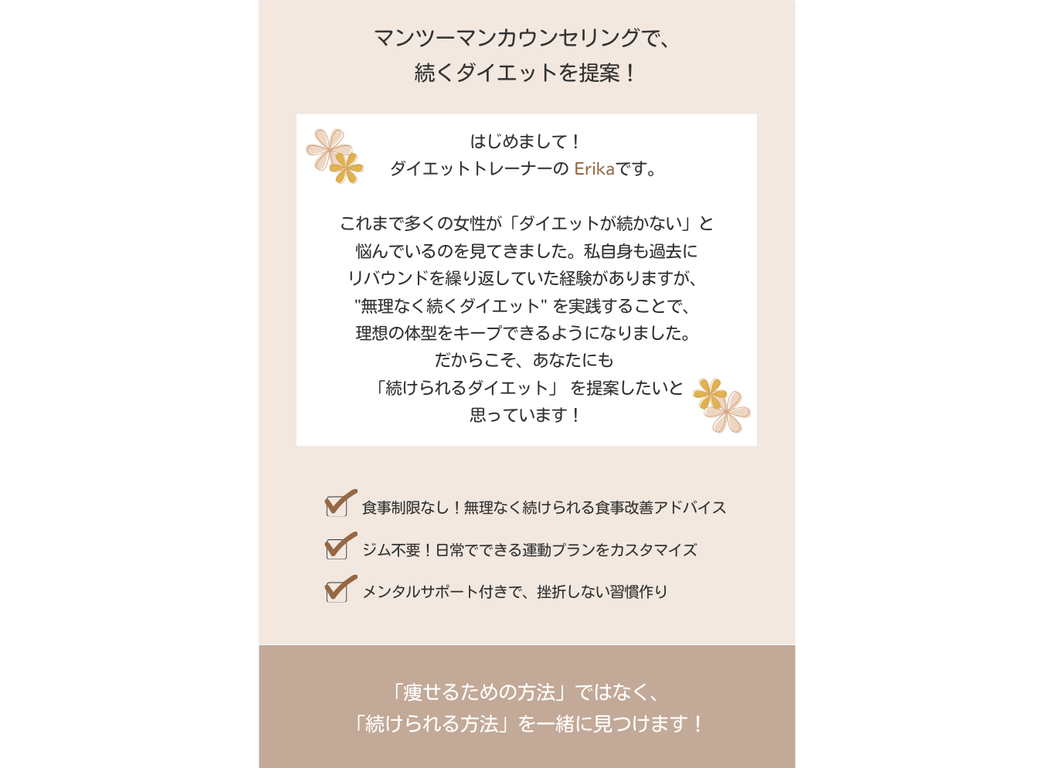 【自主制作】25〜30代の女性をターゲットにダイエットトレーナーのLP制作を行いました。 品のある印象を与えるデザインをイメージし、作成しました。