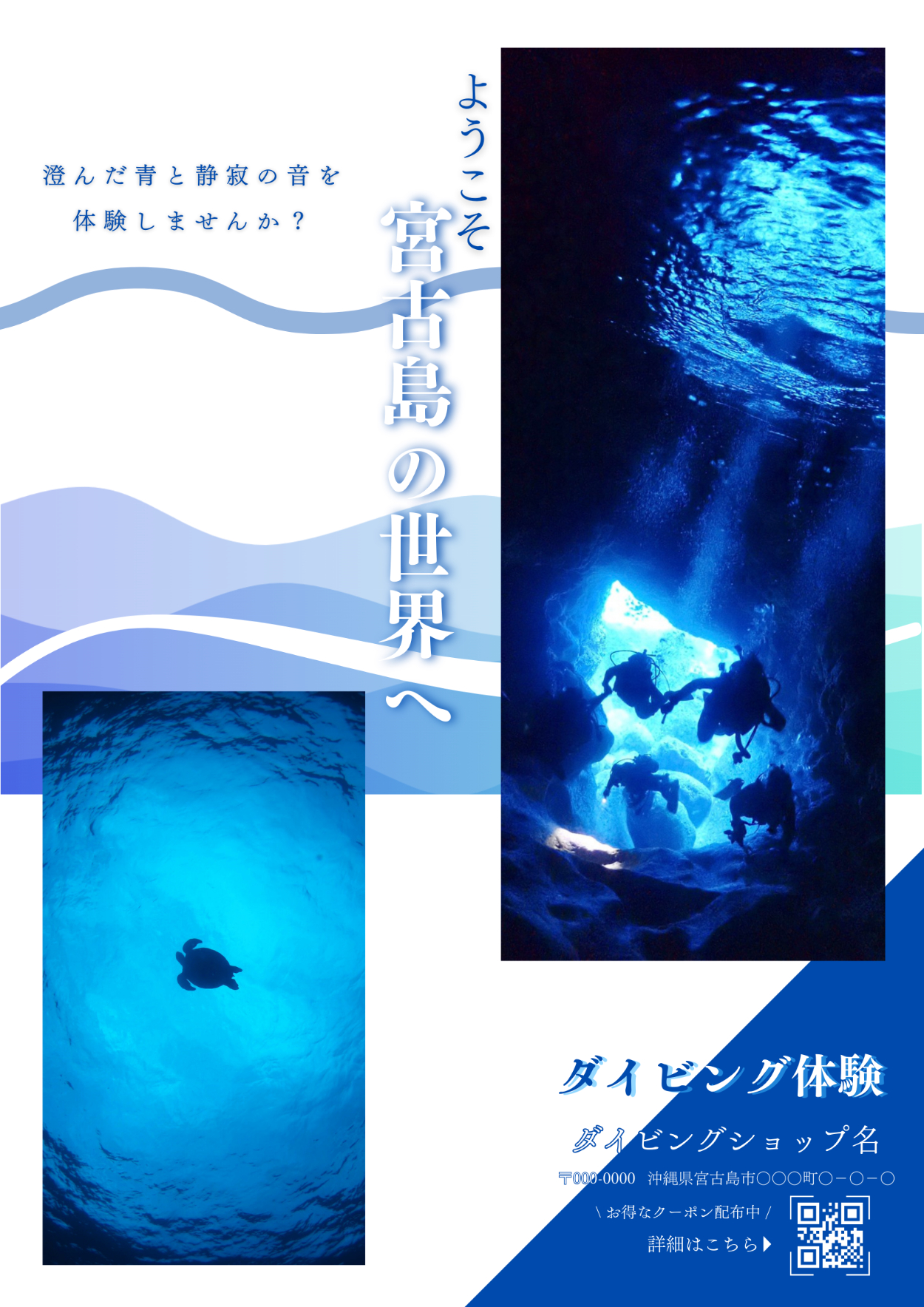 神秘的な澄んだ青を意識して作成しました。ダイビングショップ名は変更可能です。
