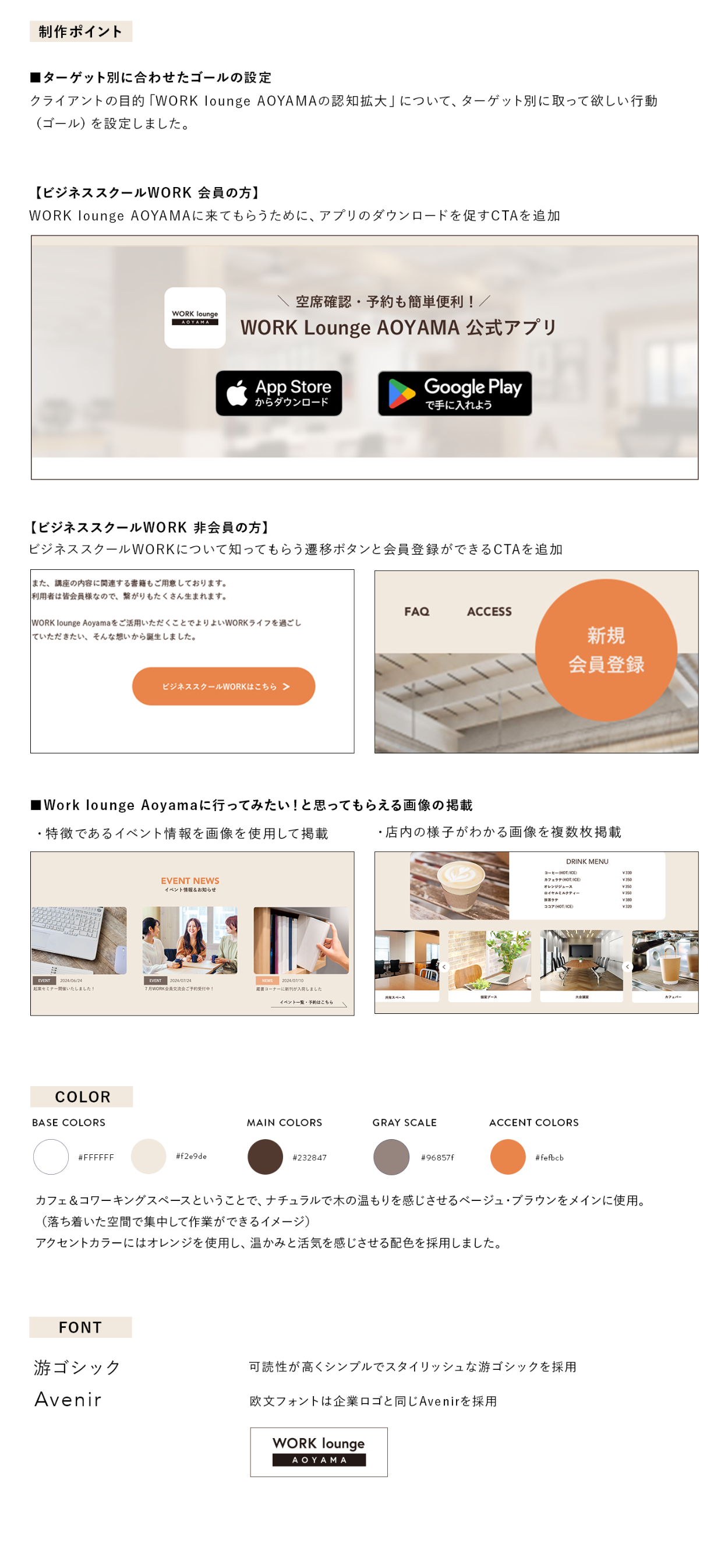 - 事前にムードボードを制作し、ペルソナからイメージをしっかり固めた上で制作に取りかかることで目的もブレずにスムーズに取り組めることがわかりました。