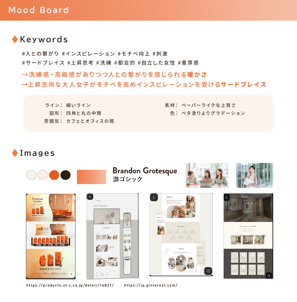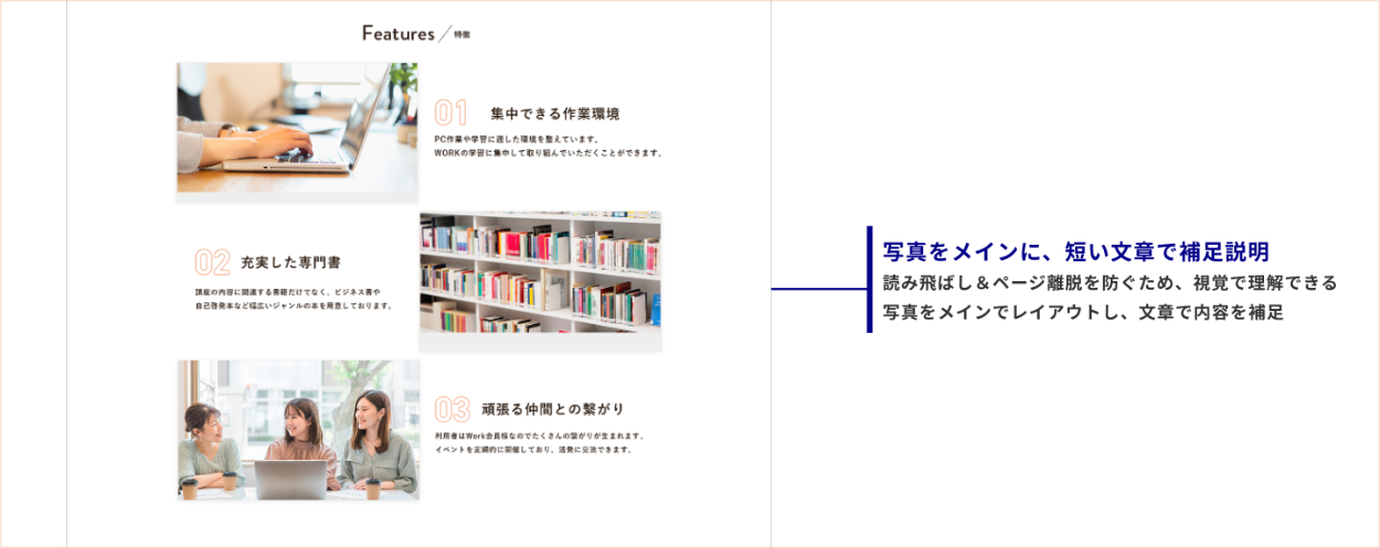 →写真や配色:温かみのある雰囲気、都会的でありながら親しみやすい空間を演出