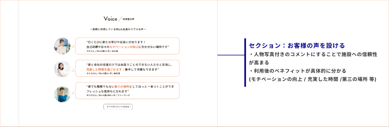 ユーザーがページをスクロールし、読み進めていく中でWORK Lounge AOYAMAの想いや雰囲気を意図した通りに受け取ってもらえるよう、トンマナ(カラー・フォント・写真のトーン)を揃え、使用するあしらいや図形のテイストにも一貫性を持たせるようにした