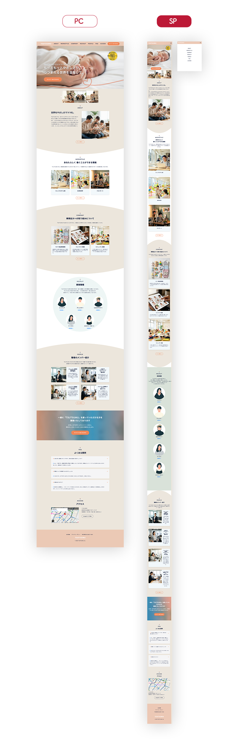 落ち着いた雰囲気を与えるベージュをベースカラーにし、人のあたたかみや温もりを感じるオレンジピンクをアクセントカラーに配色しました。全体的な統一感は大切にしながらデザインしました。