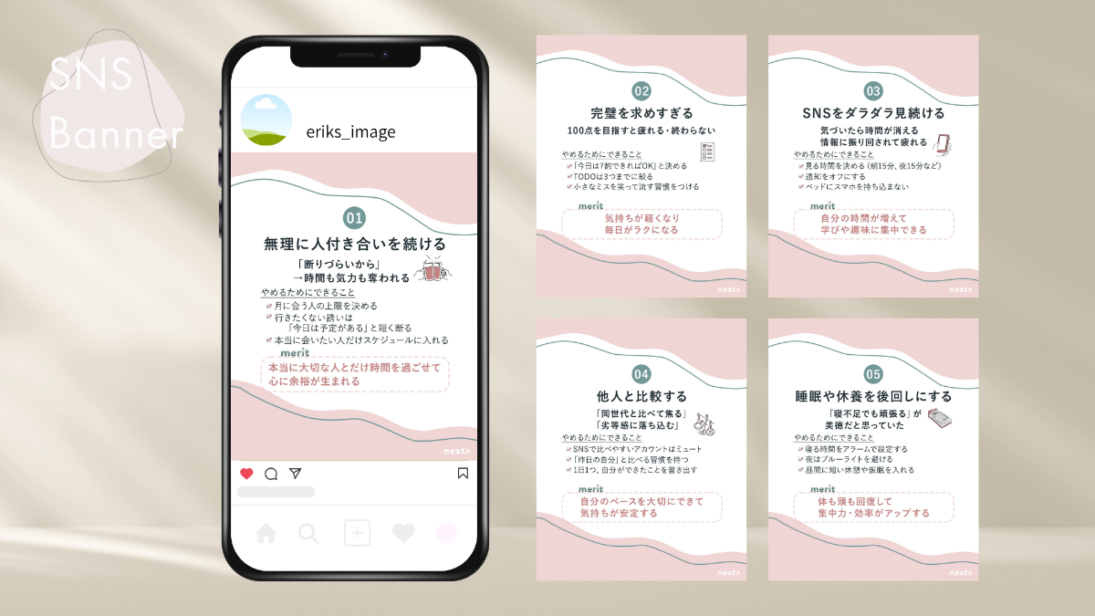 Instagramで「自分らしく生きたい30代女性」に向け、共感と気づきを届ける投稿として企画。ストレスを減らし、心が軽くなるヒントをやさしいデザインで表現しました。