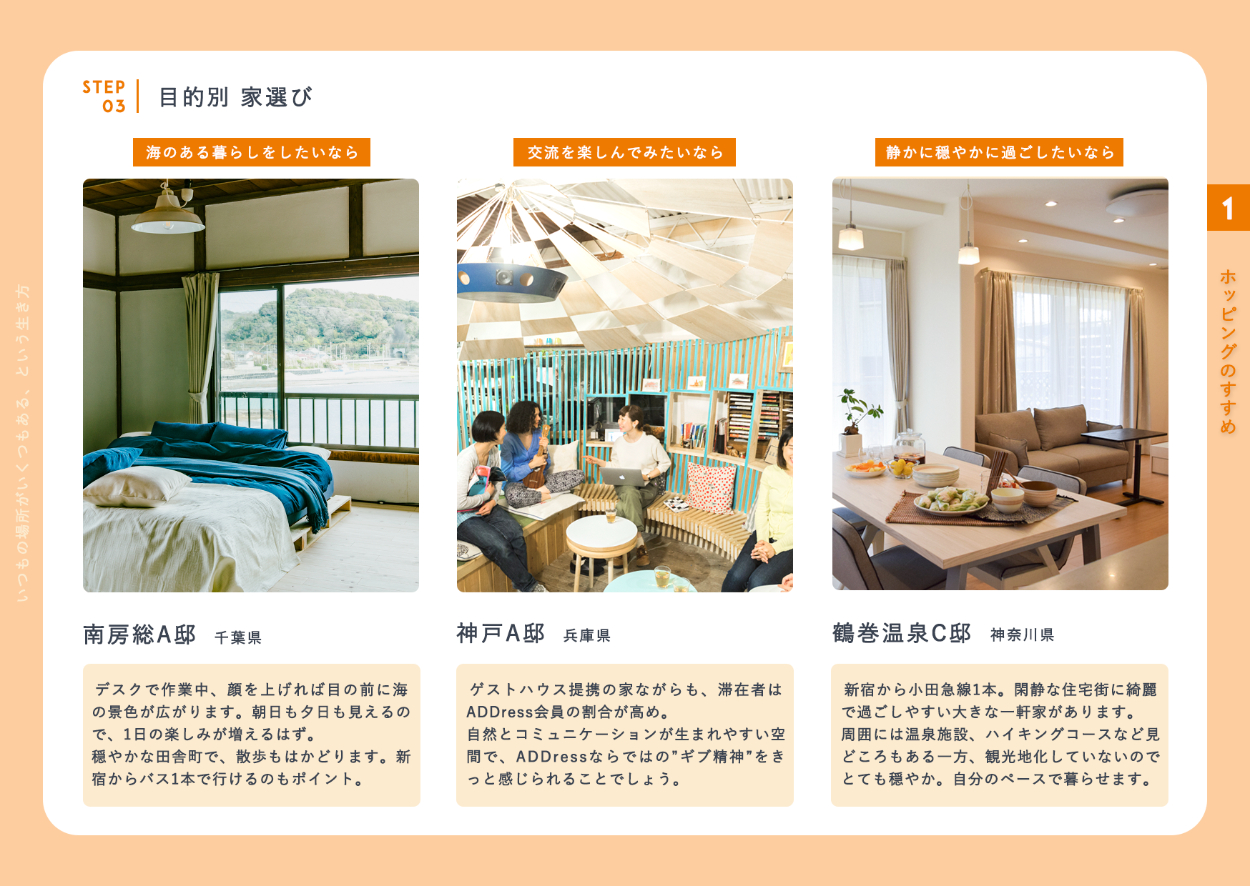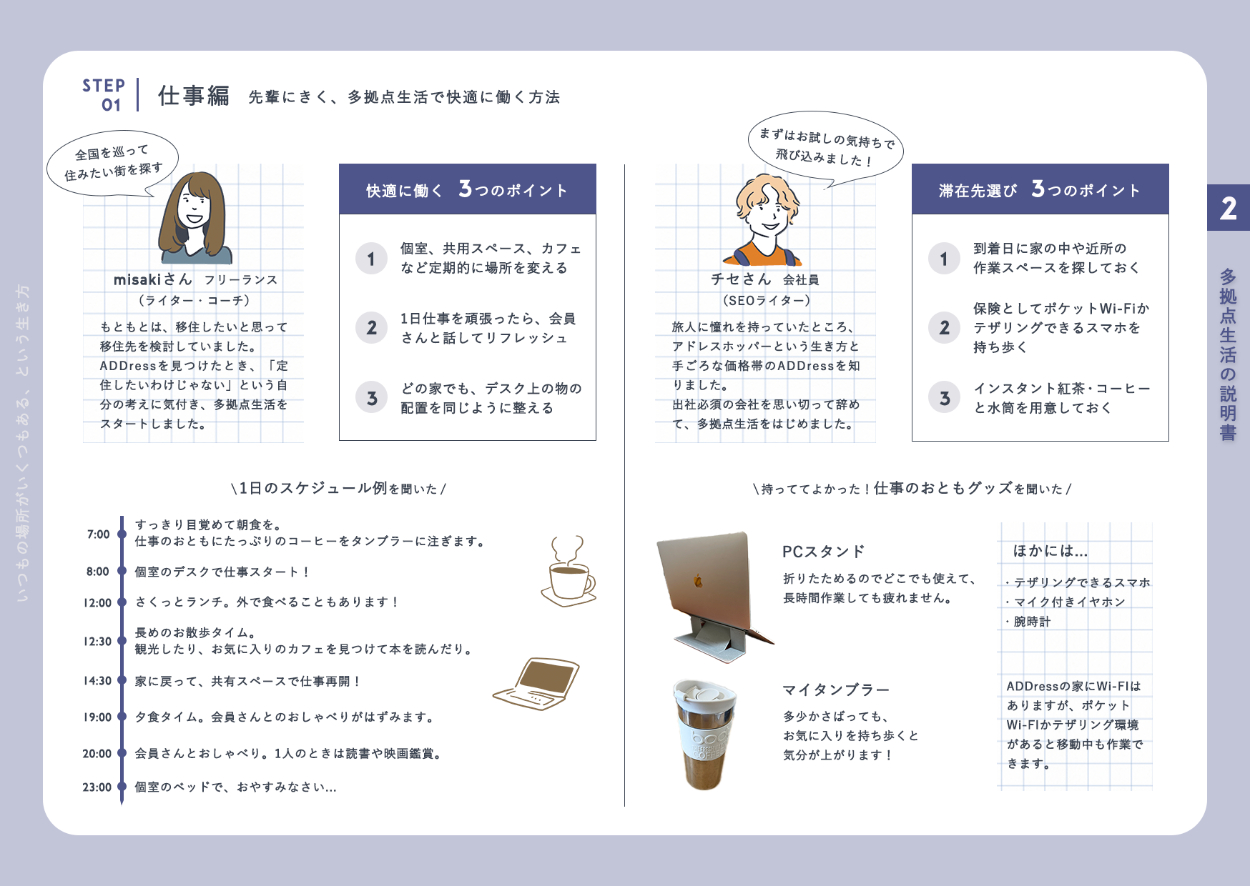 多拠点生活プラットフォームの「ADDress」を契約したばかりの方に配布する、スムーズに多拠点生活を始めるためのtipsなどを記載したデジタルブック(10ページ)を制作しました。