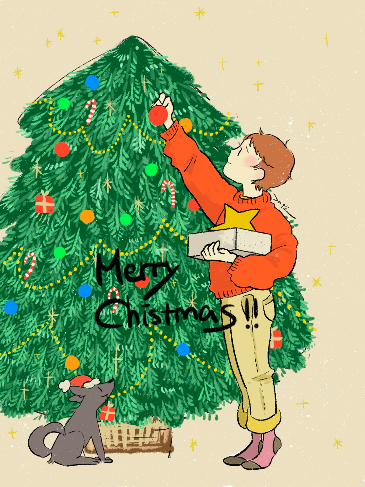 子供が背伸びをして飾り付けをしている様子・ツリーのてっぺんに置かれる星はまだ手元にあり未完成であることから、クリスマスへの期待と待ち遠しさが伝わると嬉しいです。