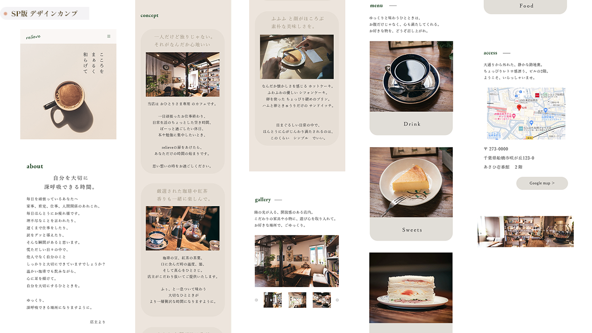 キャリアスクールSHElikes Webデザイン実技課題にて「架空カフェのHP」を制作しました。