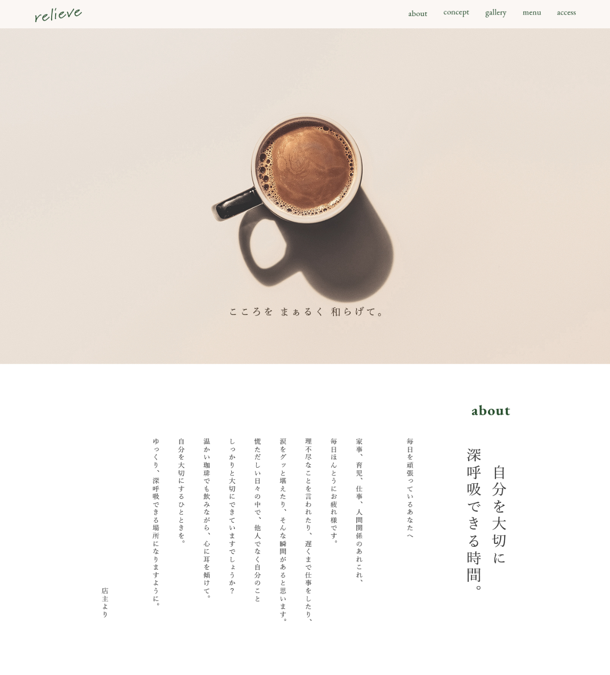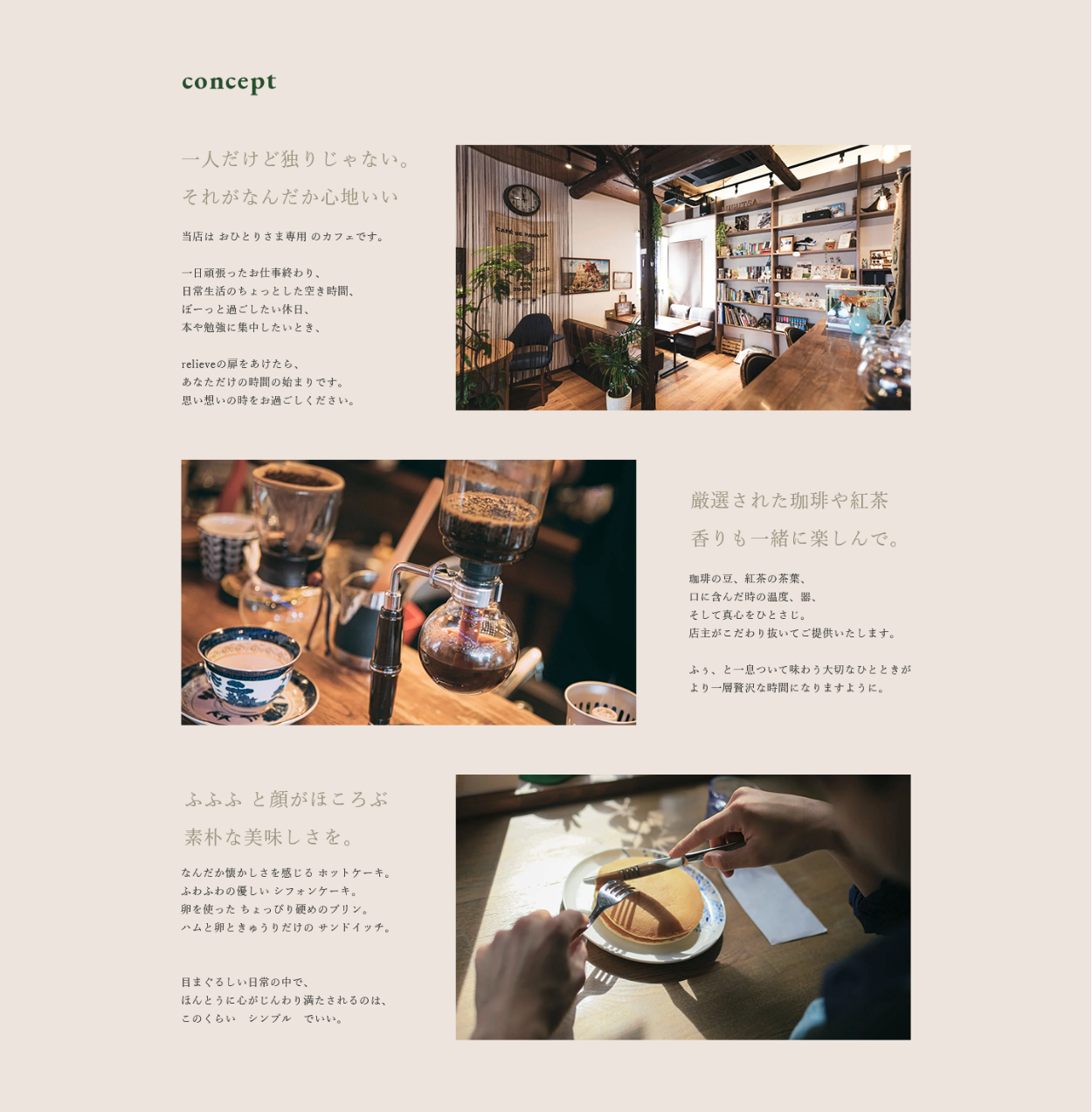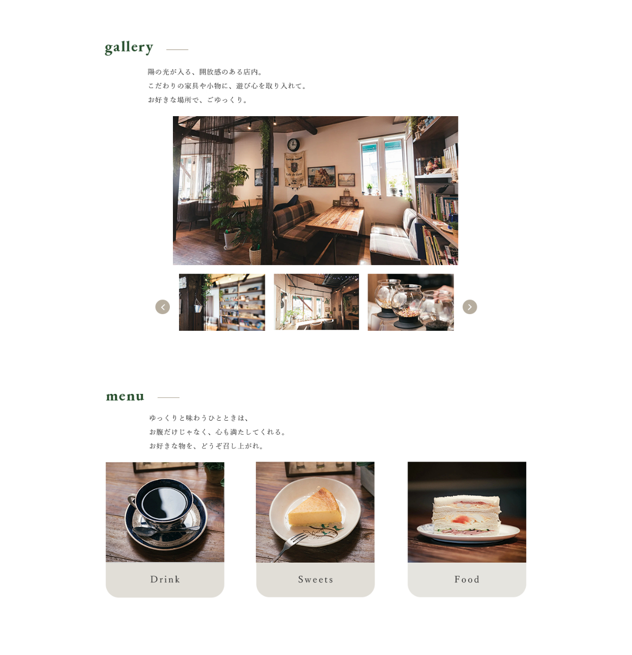 ・このカフェの軸となる、店主の3つのこだわりをしっかり伝える為にabout部分と同様にjqueryを使用した