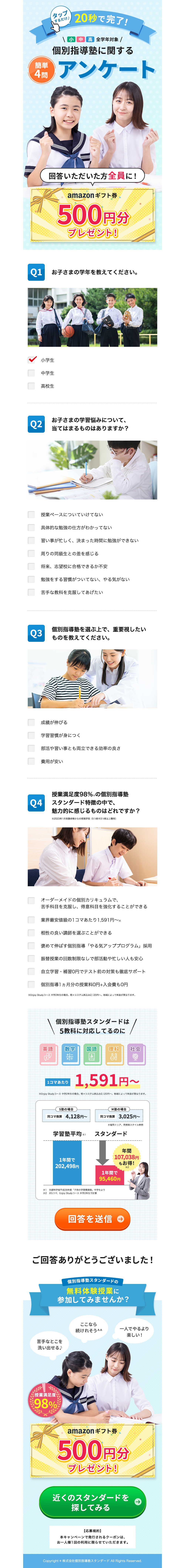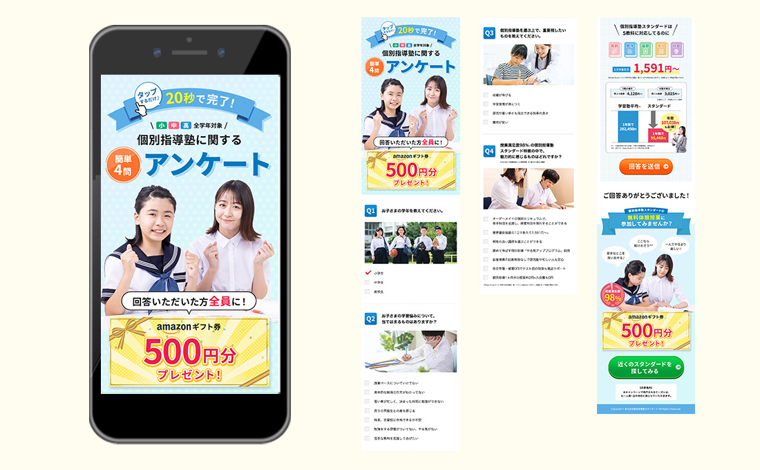 - アンケートが面倒だと離脱してしまわないよう、ファーストビューで"20秒""4問"など、簡単なアンケートであることを文字強調やフォントカラーで目立たせました。