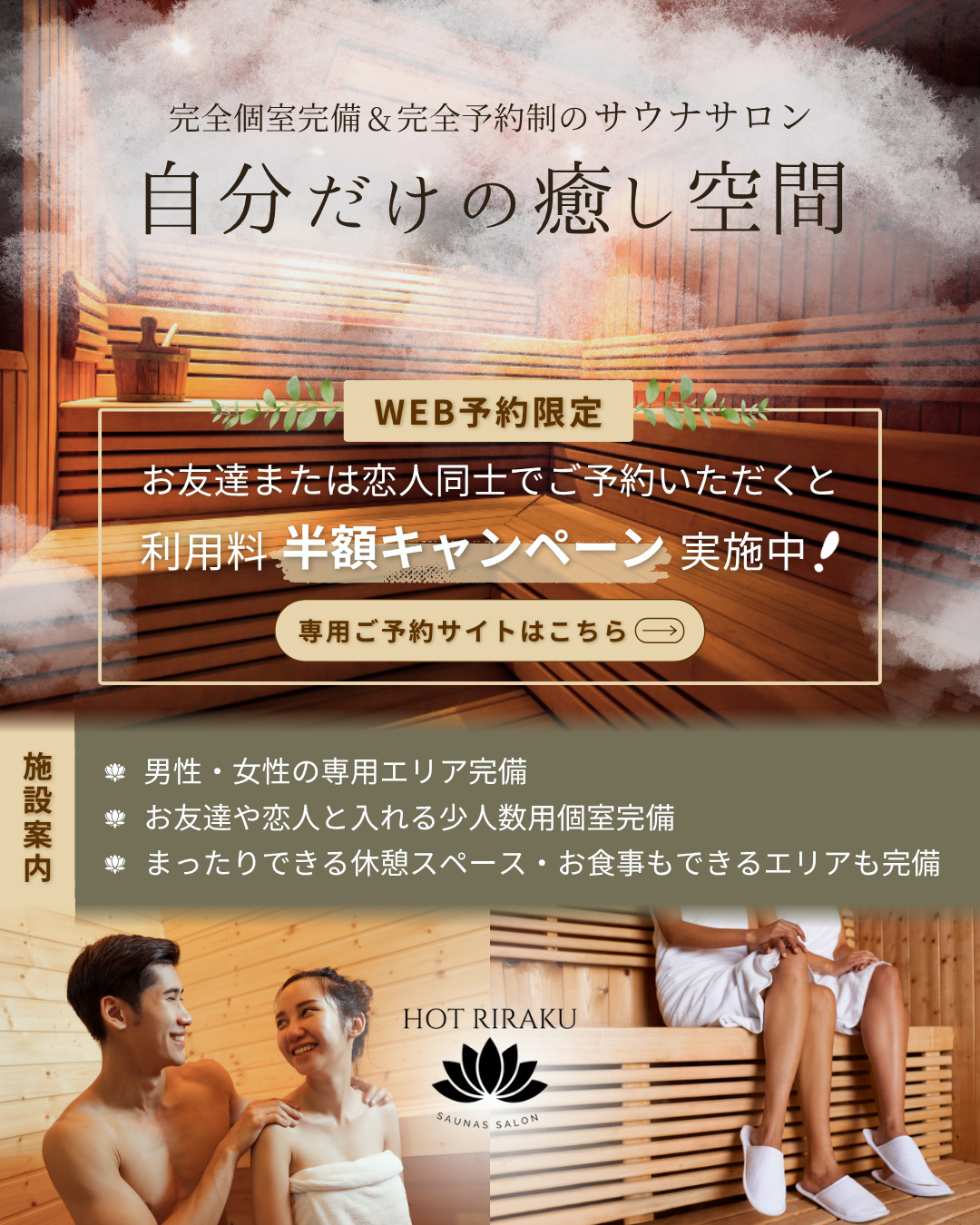 サウナが初めての人でも友達・恋人同士で利用できるので安心+半額でお得!