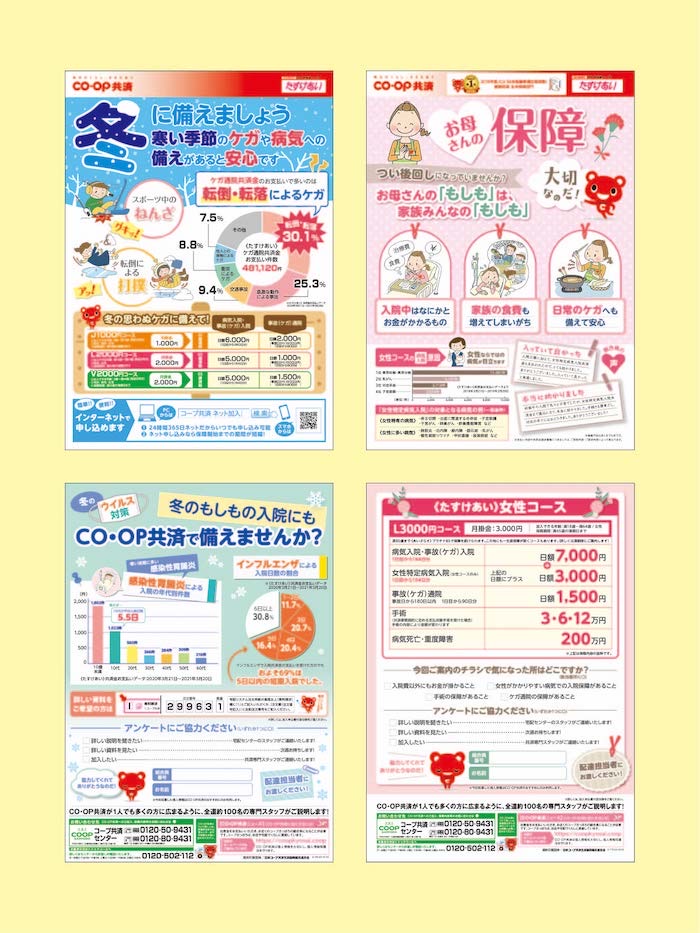 コープ共済のチラシ 伊藤 グラフィックデザイナー/イラストレーター OVERVIEW コープの宅配をご利用のお客様にお届けしている、保険をおすすめするチラシです。 お客様はほとんど主婦の方が多いと思うので、女性の方に手にとっていただきやすいようなデザインを毎回心がけています。