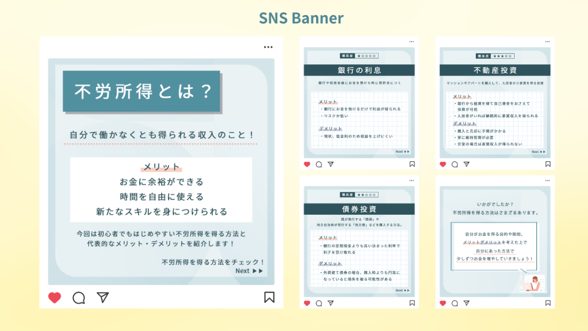SHE株式会社様の運営するキャリアスクール「SHEmoney」のSNSに掲載するバナーを制作しました。コンペ形式で残念ながら採用はされませんでしたが、自主制作として掲載いたします。(制作期間:1週間 制作時間:18時間 使用ツール:Photoshop)