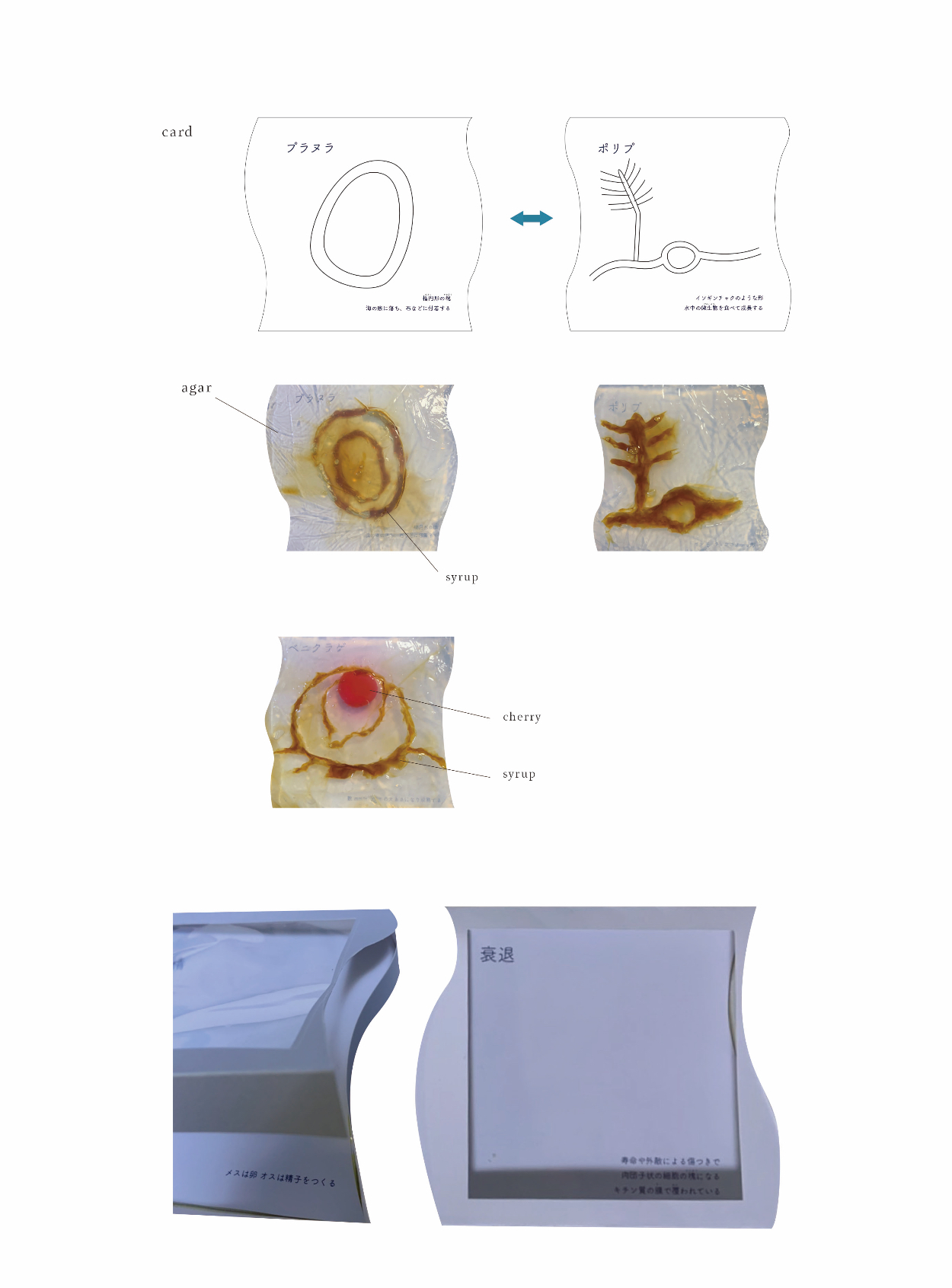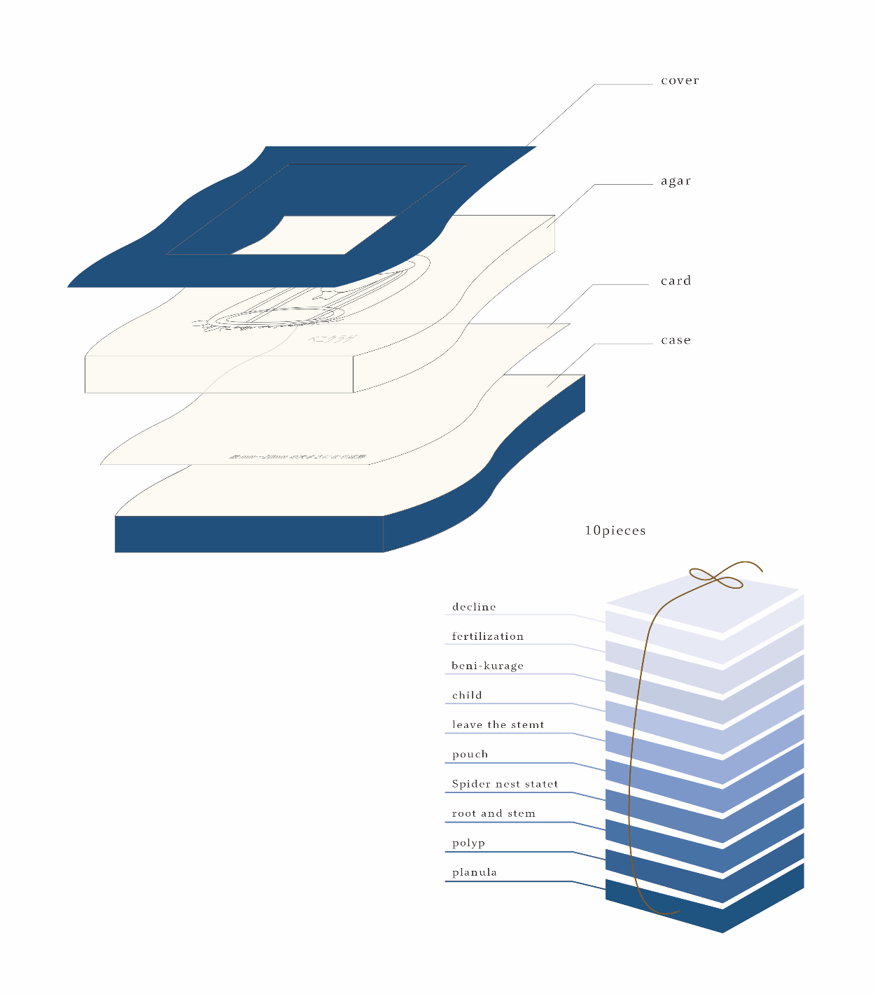 These cards are jigsaw puzzle type so can be combined. These are made of agar. It is composed of 10 processes of the beni-kurage's rejuvenation. A piece comes to be combined only in the order of the correct rejuvenation. Agar is elasticity and transparency to reflect the image of a visual of the jellyfish. The agar has dug the picture which processes of rejuvenation. And we can see the clear picture when you pour syrup onto it.