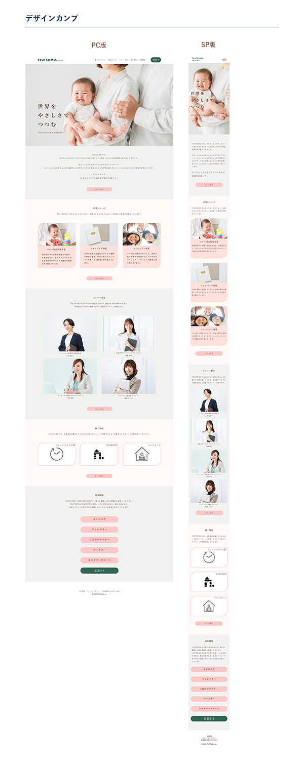 SHElikes PRO デザイナーの課題で、架空のベビー事業を手掛ける会社の採用サイトを作成。要件書をもとに、PC・SP双方のワイヤーフレームとデザインカンプ作成、レスポンシブを含むコーディング、サーバーアップと、Webデザインのフローに挑戦した。