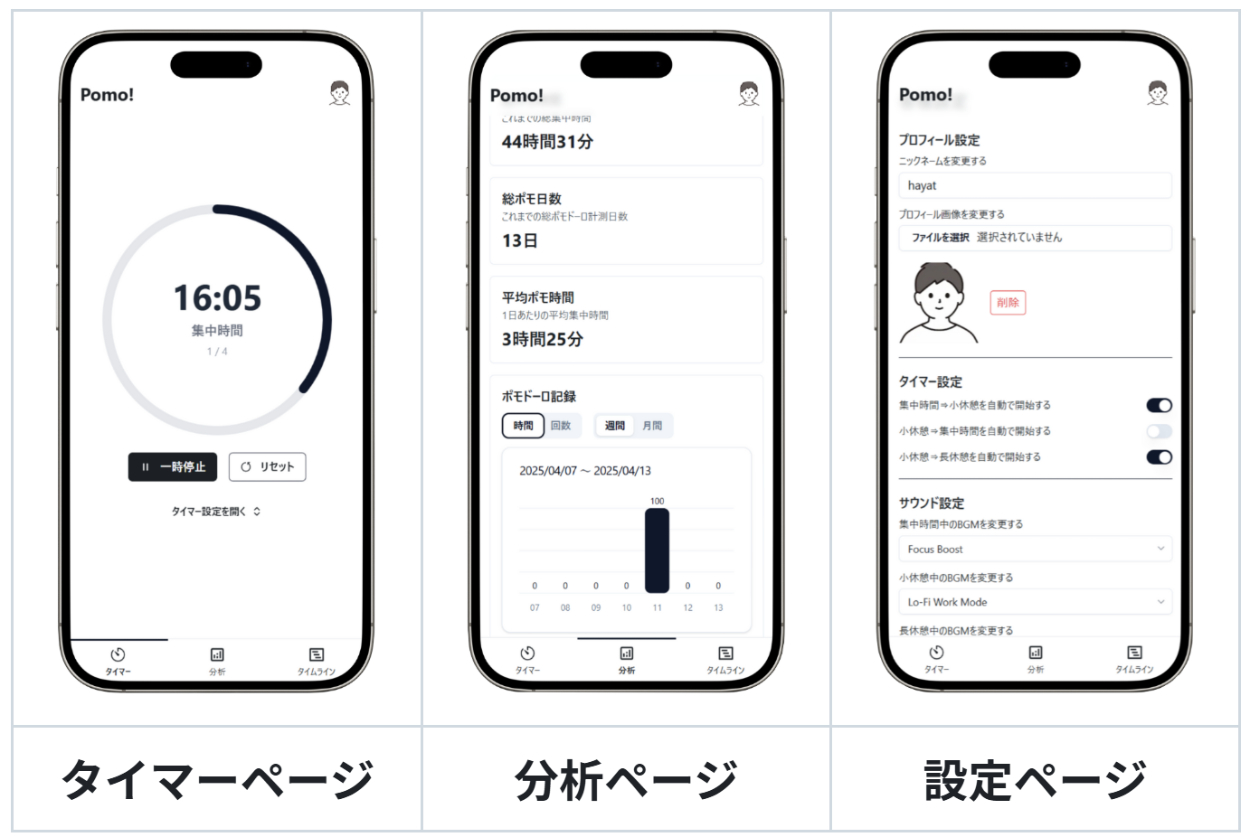 タイマー機能, 分析機能, タイムライン投稿, ランキング, カスタマイズ機能(BGM・SE変更, タイマー背景画像, フォント変更), etc.
