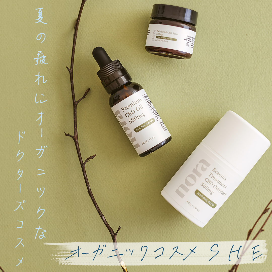 必須要素:キャッチコピー「夏の疲れに オーガニックなドクターズコスメ」、ブランド名「オーガニックコスメSHE」、製品画像