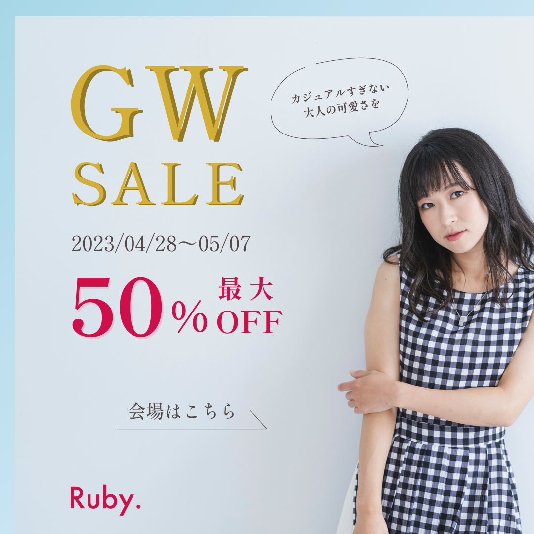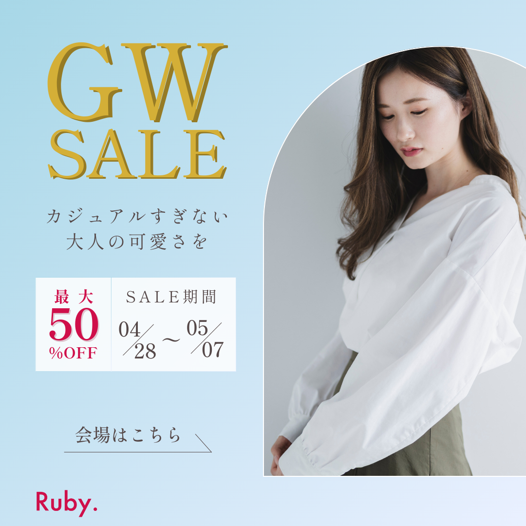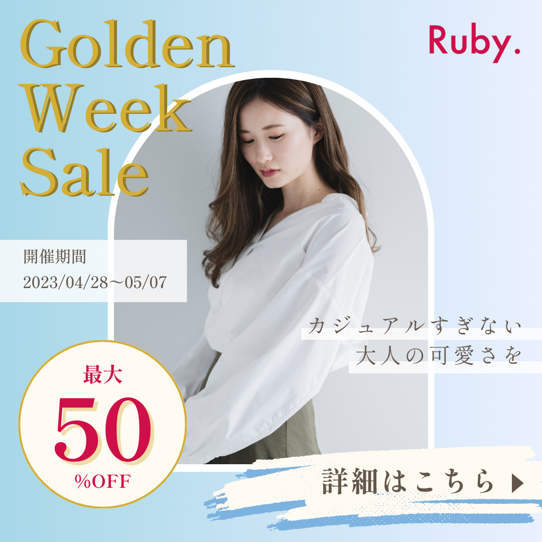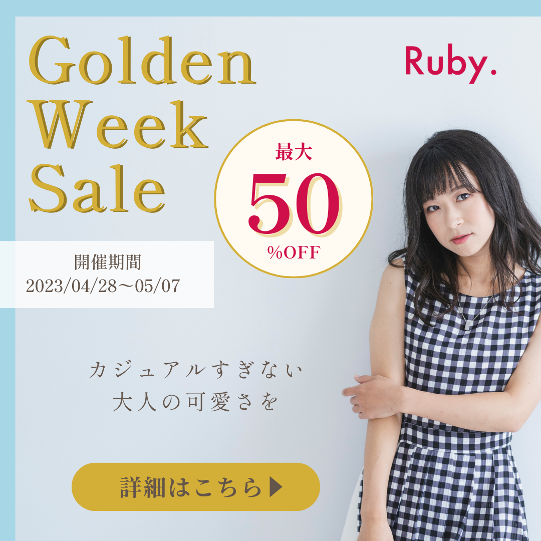 【HerTech架空案件】Ruby.のゴールデンウィークセールを告知するInstagram用バナーを制作しました。20代後半〜40代女性向けのフェミニンなブランドイメージを意識し、初夏を感じる爽やかな色合いでデザインしました。