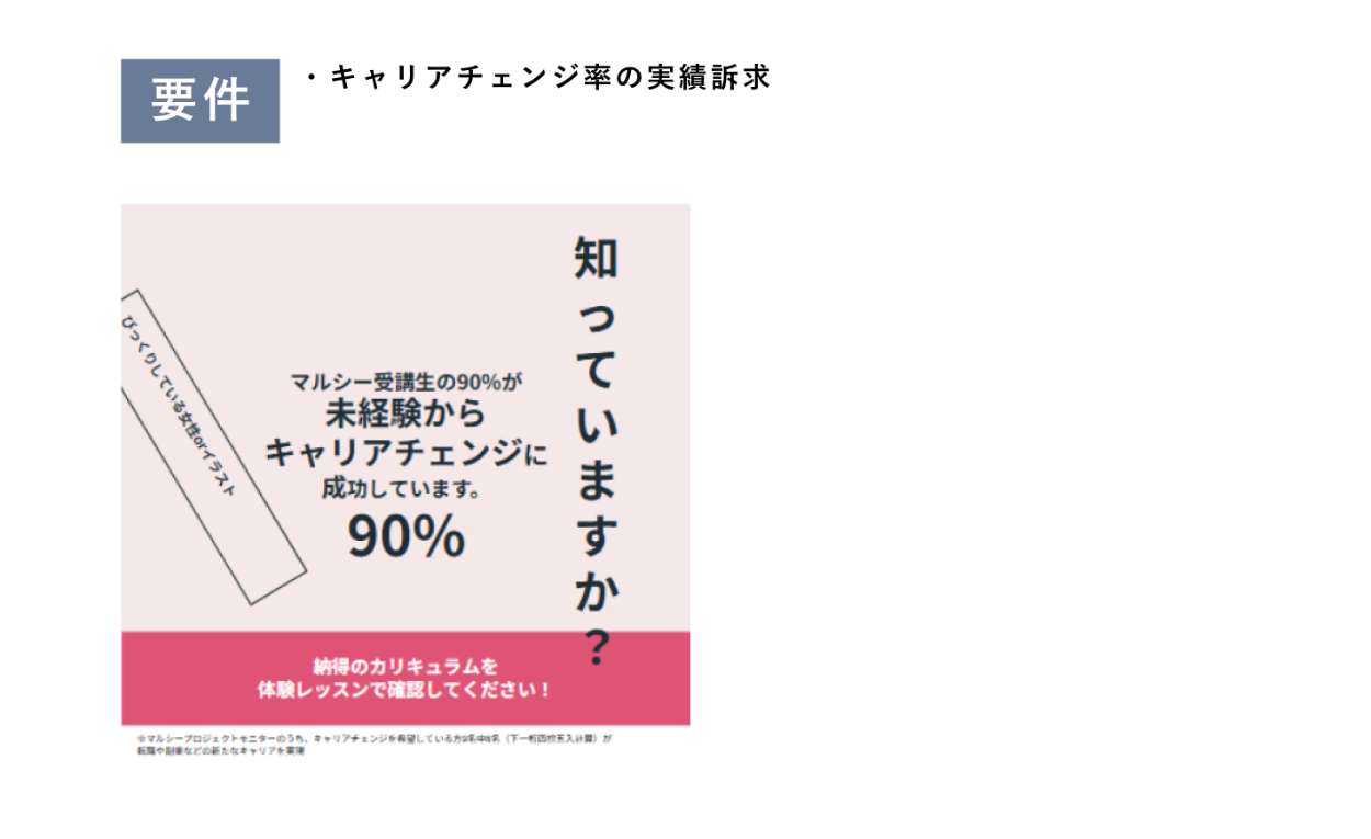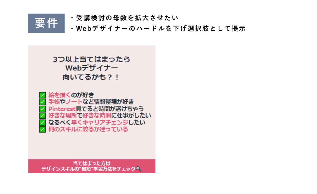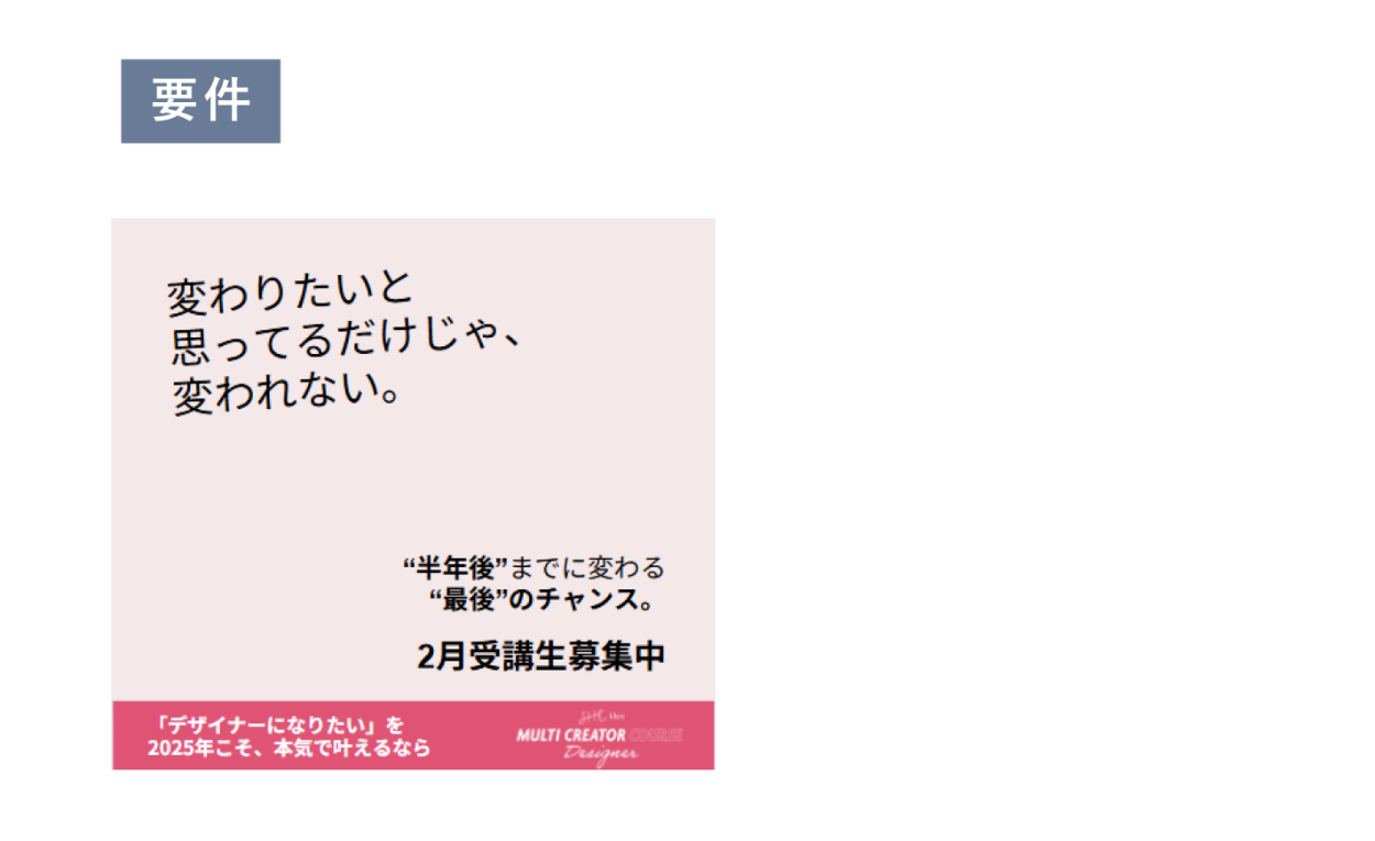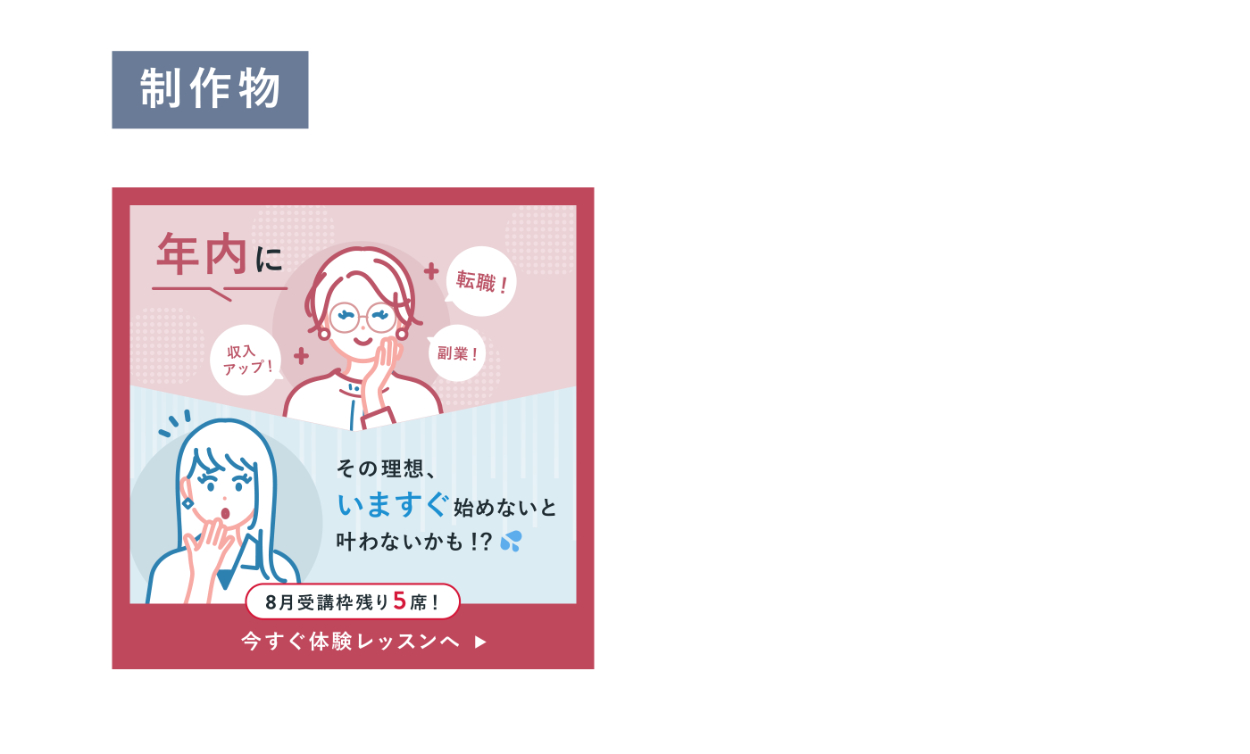 - ビフォーのバナー例には、私自身もデザイン勉強中にやってしまいがちだった〈ドロップシャドウのつけすぎ〉や〈コントラストの低さ〉などのリアルな初心者デザインを提示し、受講検討中のターゲット層の関心を得る。