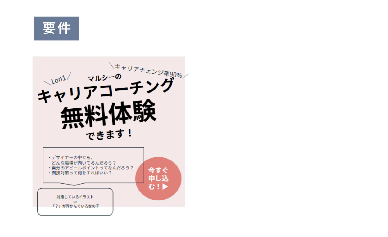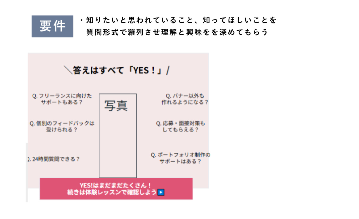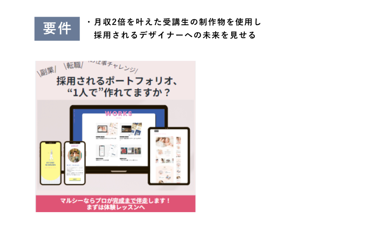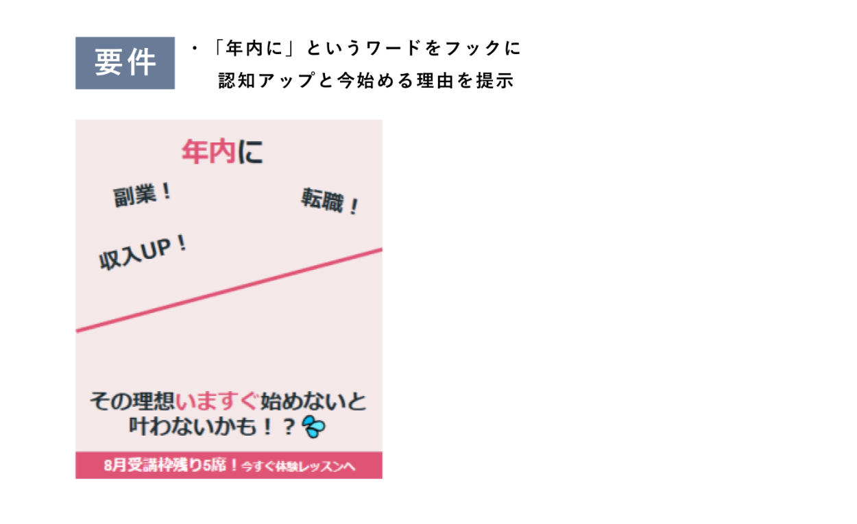 - ビフォーのバナー例には、私自身もデザイン勉強中にやってしまいがちだった〈ドロップシャドウのつけすぎ〉や〈コントラストの低さ〉などのリアルな初心者デザインを提示し、受講検討中のターゲット層の関心を得る。