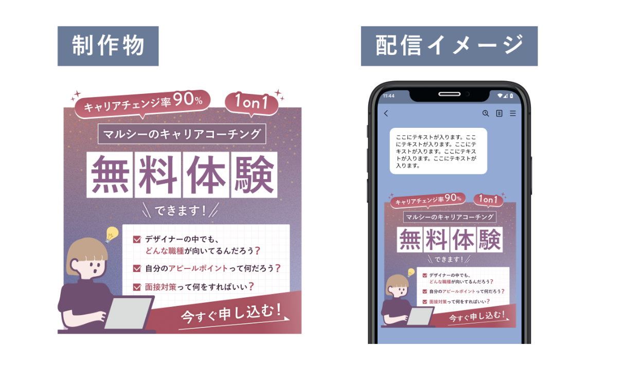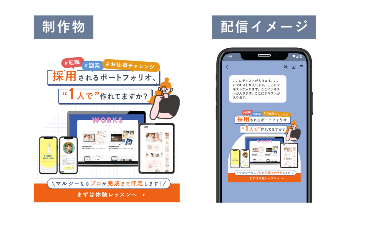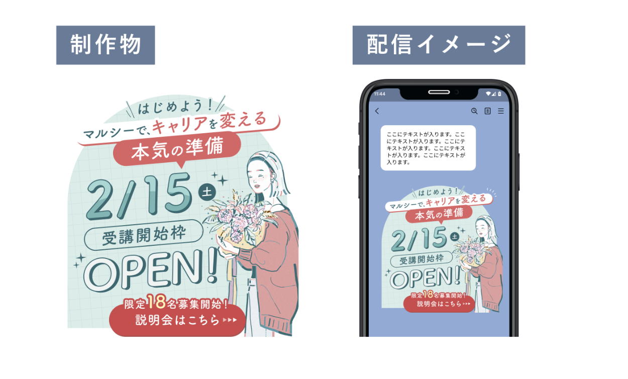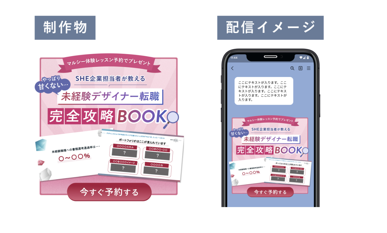 女性向けキャリアスクールSHElikes MULTI CREATOR COURSE Designer様(略称:マルシー)のLINE配信バナーを制作しました。体験レッスン申し込みを目的とした制作物になります。(使用ツール:Figma)