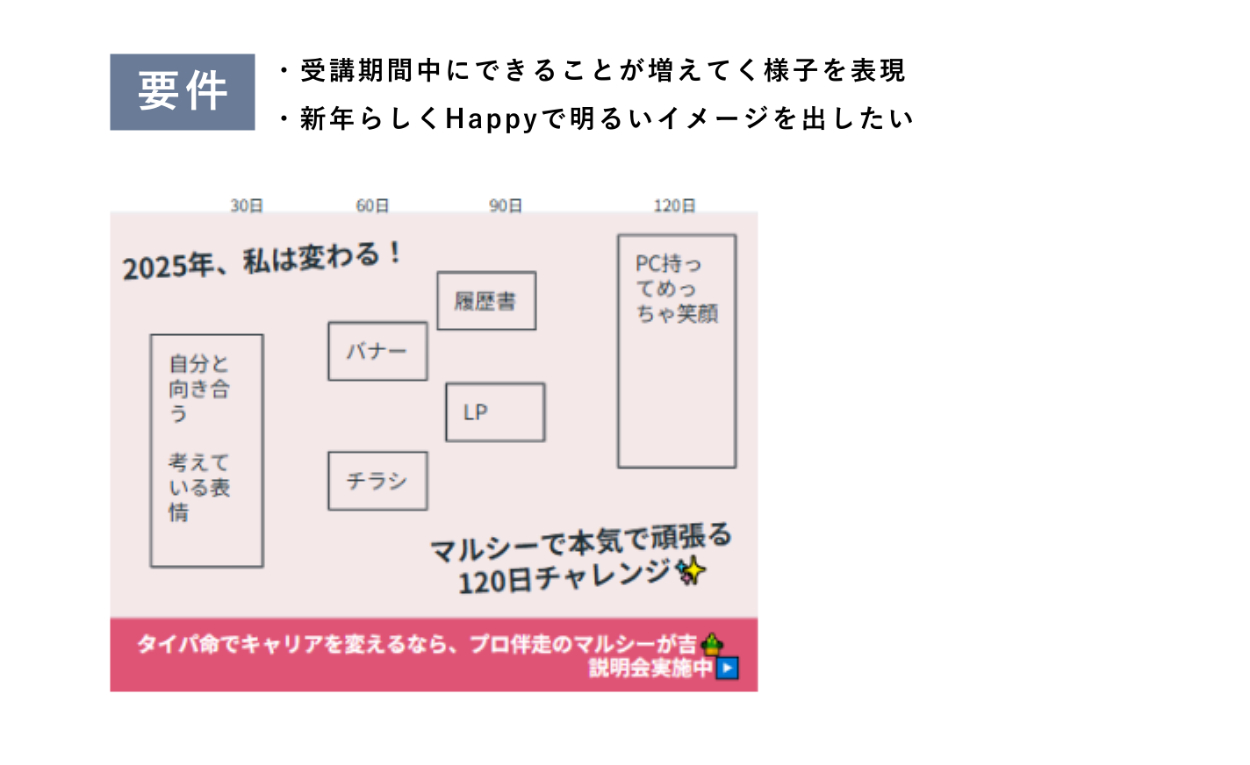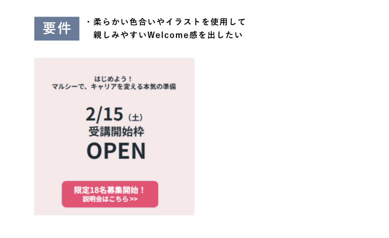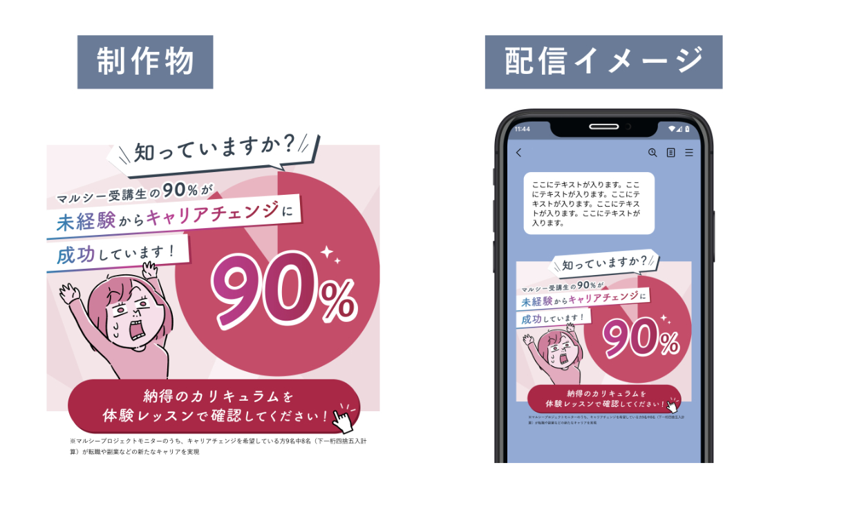 女性向けキャリアスクールSHElikes MULTI CREATOR COURSE Designer様(略称:マルシー)のLINE配信バナーを制作しました。体験レッスン申し込みを目的とした制作物になります。(使用ツール:Figma)