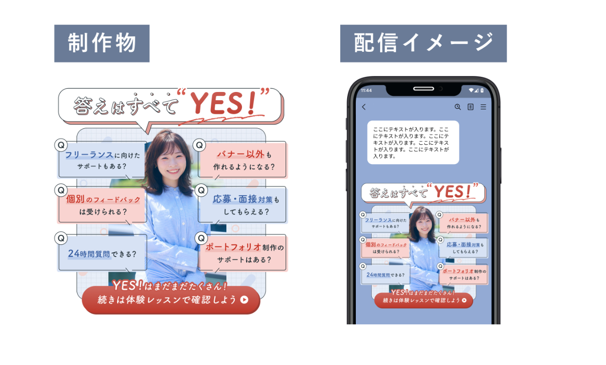 - 背景透過を利用して、それぞれの質問や吹き出しを独立させ、立体感のあるデザインで注目度を上げた。