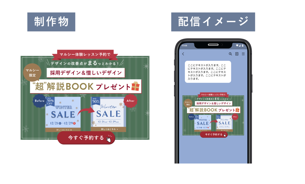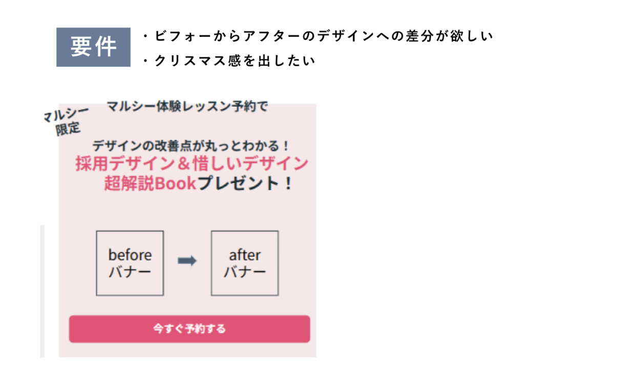 - 雪の結晶や配色などでクリスマスの雰囲気を出しつつ、ビフォーアフターバナーの妨げにならない程度に抑え、要点が分かりやすいデザインを意識した。