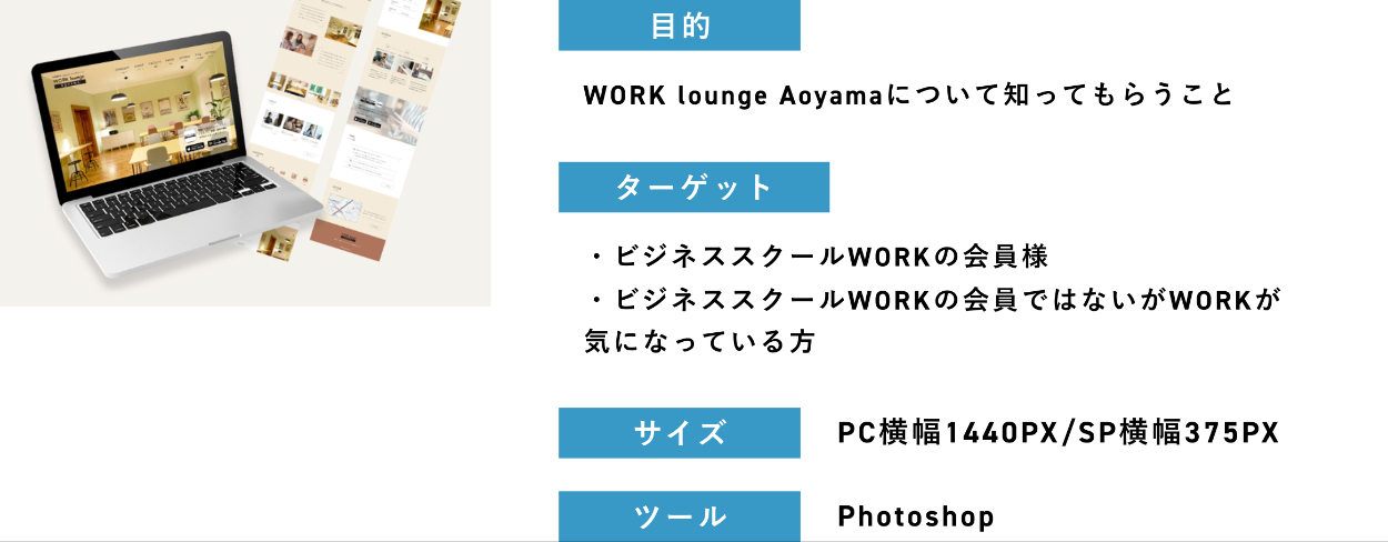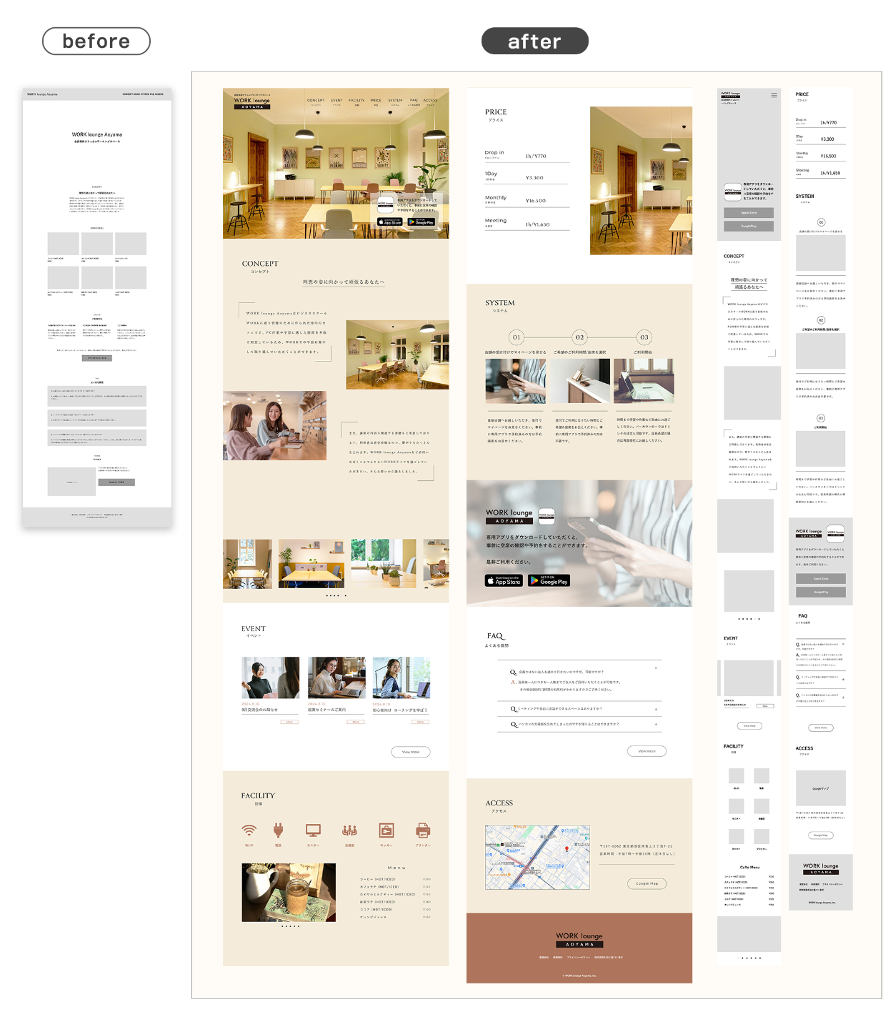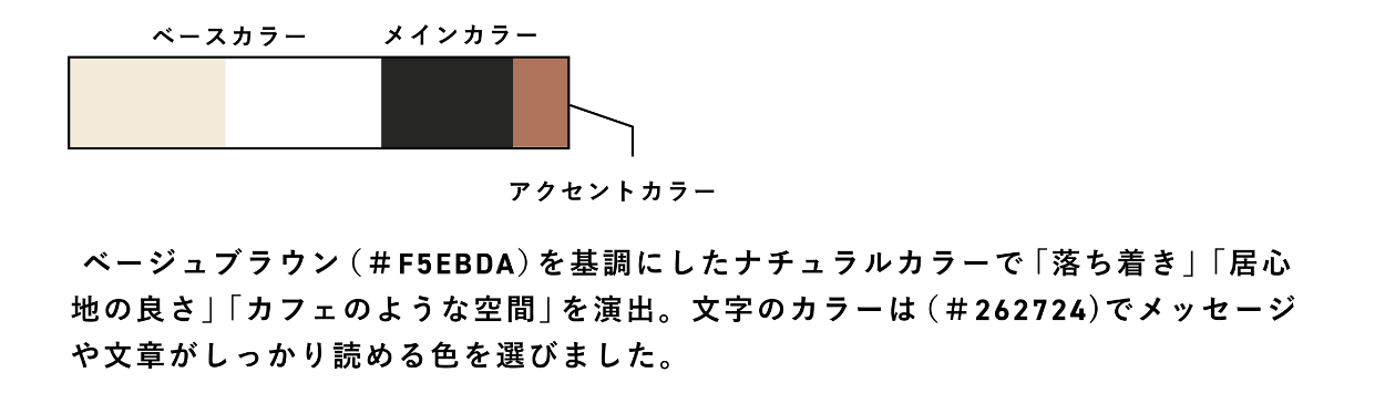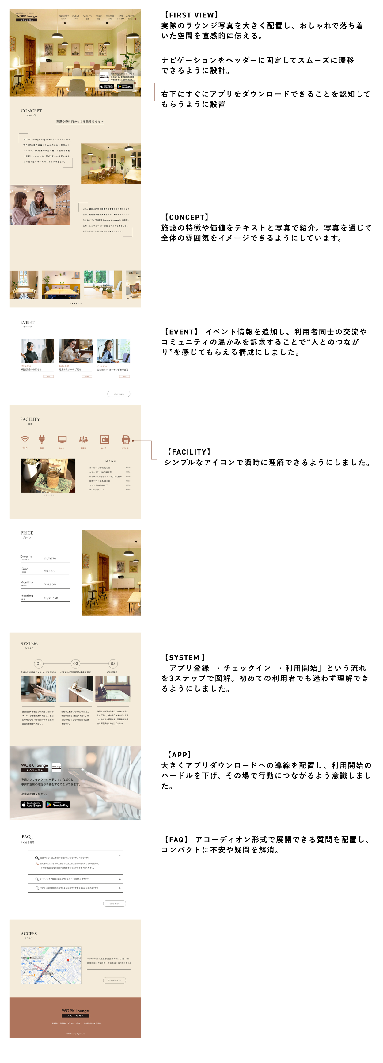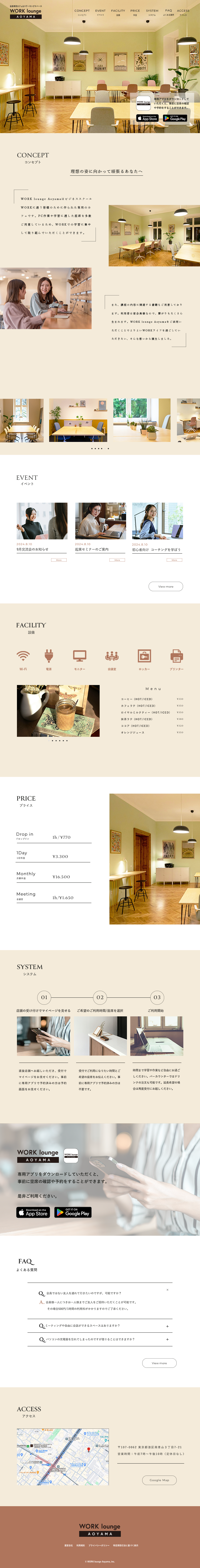 ターゲット層である20代〜30代の方にも心地よく利用いただけるよう、暖かみのあるお洒落なカフェの雰囲気を意識しました。余白を活かしたレイアウトで、ゆったりと仕事に集中できる落ち着いた雰囲気をイメージして制作しました。