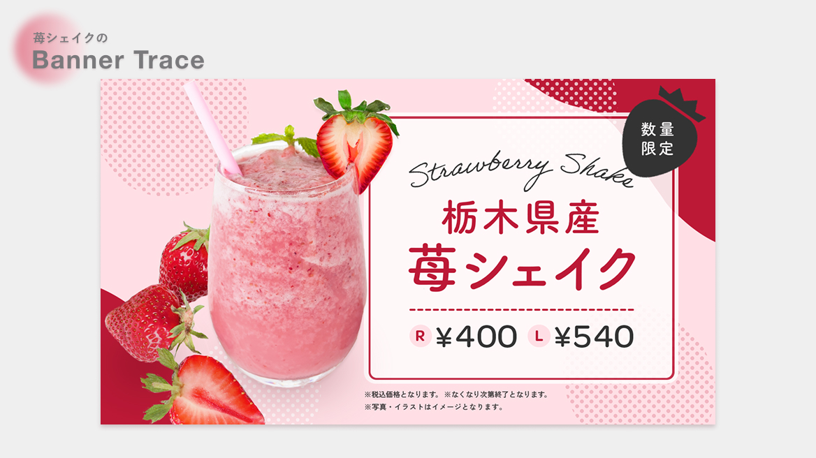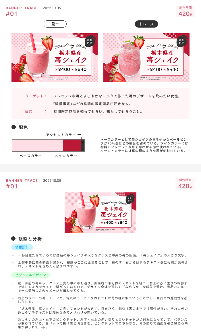 【架空】苺シェイクのバナートレース Naho M. Webデザイナー OVERVIEW SHE likes PRO DESIGNER COURSの1つ目の課題として、バナートレースに取り組みました。また「ターゲット」「目的」「デザイン」「配置」などについての分析結果もまとめました。 YEAR 2025