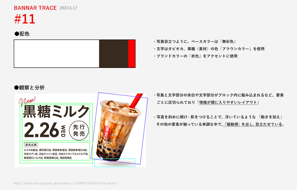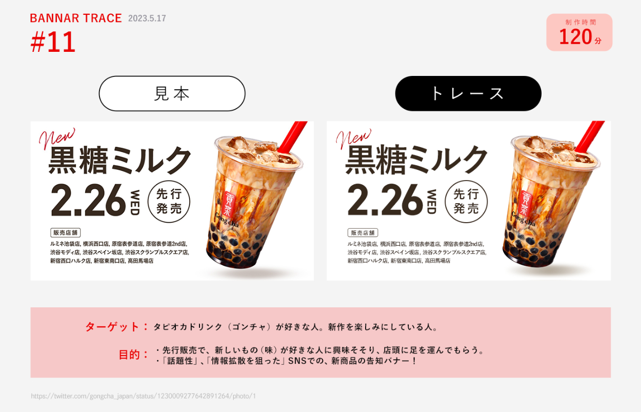 トレースする前に、バナーの目的・ターゲット(背景)を考え→その目標達成するためにどのようなデザインが施されているのか?考えた上で、トレースをすることで、パッと見ただけでは、見落としがちな、なんとなくよく見える・細部のデザインの工夫まで、理解・学ぶことができました。