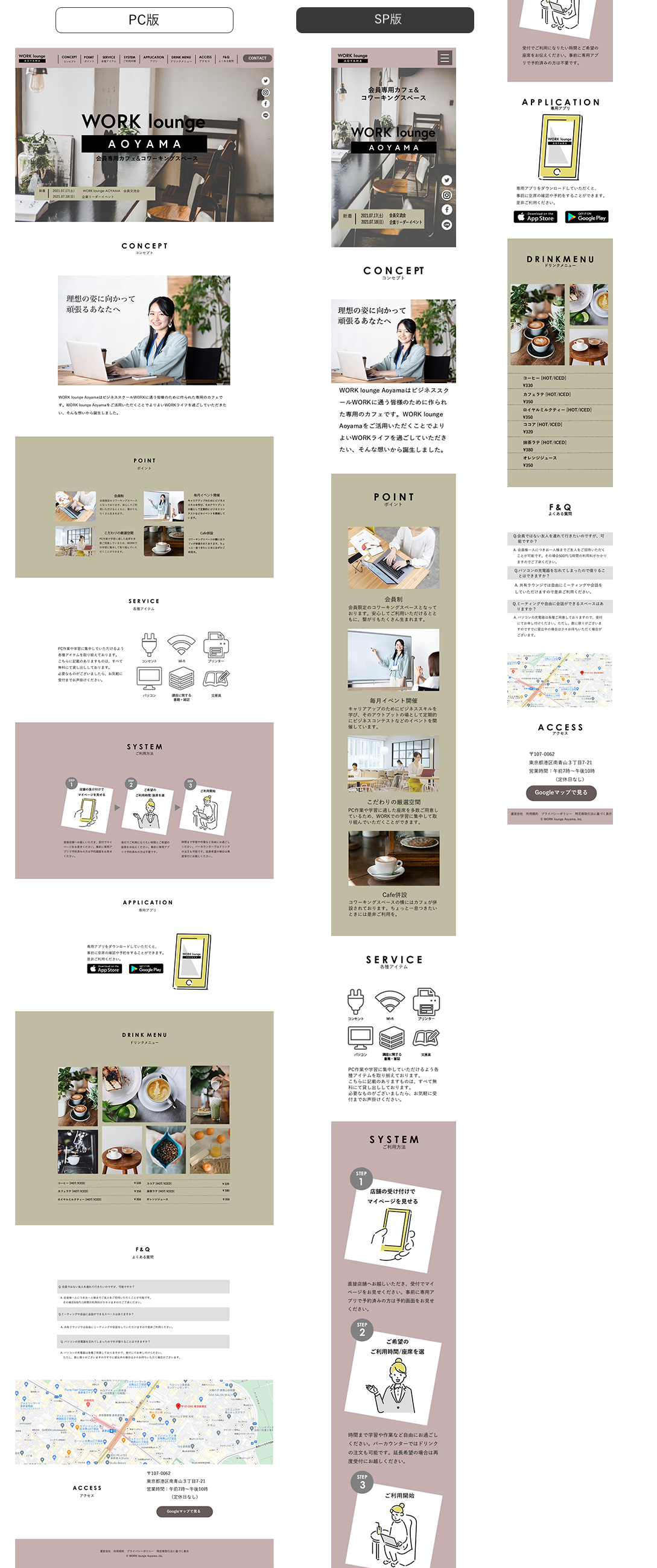 SHElikes MULTI CREATOR COURSEの課題で、コワーキングスペースのWebサイトのデザインカンプを制作。クライアント様からの要件書とワイヤーフレームをもとに、PCとSPのデザインカンプを制作しました。(制作時間:約2週間)(Photoshop使用)