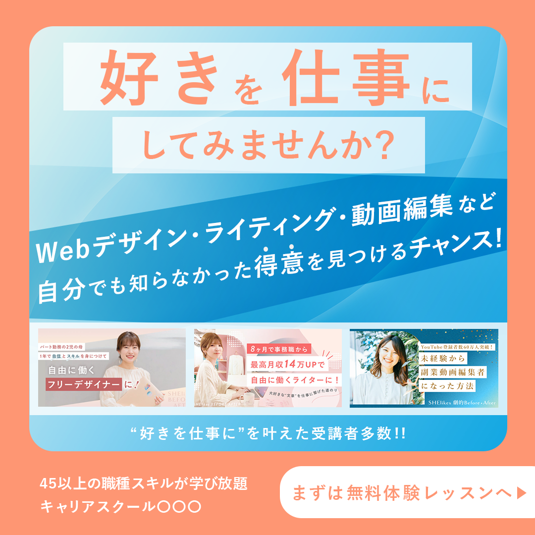 【自主制作】CRM配信用バナー制作 菜美 Webデザイナー/バックオフィス OVERVIEW 某女性向けキャリアスクールのLINE配信用バナーをイメージして自主制作しました。 YEAR 2024 使用したツール・・Photoshop依頼内容・・・・・自主制作 【こだわりPOINT】「好きを仕事にしませんか?」というキャッチフレーズから、前向きで明るい未来をイメージしたのでオレンジとブルーを使いアクティブさを表現した点キャッチコピーを見えやすくするため文字したに帯を引き、視認性を工夫した点
