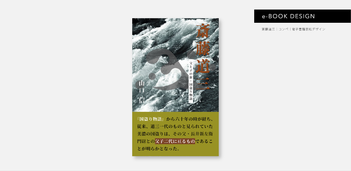 斎藤道三の家紋「二頭立浪」に合わせ、背景に海の波の写真を置き、家紋ロゴも作成、配置。また、「国盗り」という単語の持つドラマチック性を背景の海の波の写真で表現。なるべく日本の海の色合いに合わせ、暗い色の海の写真を選出しました。
