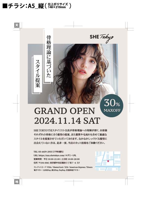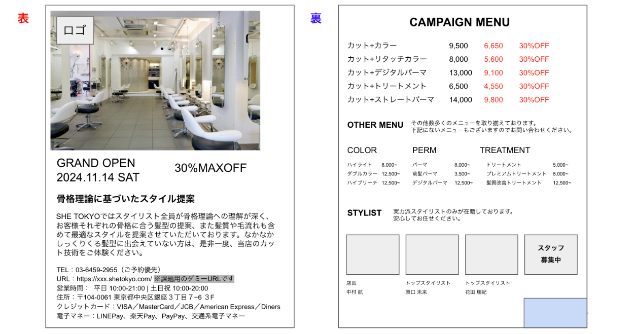 情報量の多い裏面をまとめるため、動画を見ながらヒアリングの結果をエクセルにまとめて要件定義しました。骨格理論という知らない分野の知らない単語が出てきたので、調べて理解してから制作しました。クーポンに関しては、切り取る部分をわかりやすくするために点線で囲みました。ムードボードに沿ってシンプルでスタイリッシュな大人の雰囲気が伝わる配色を心がけました。