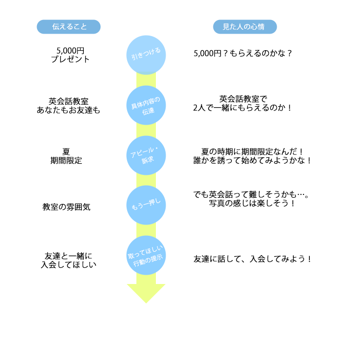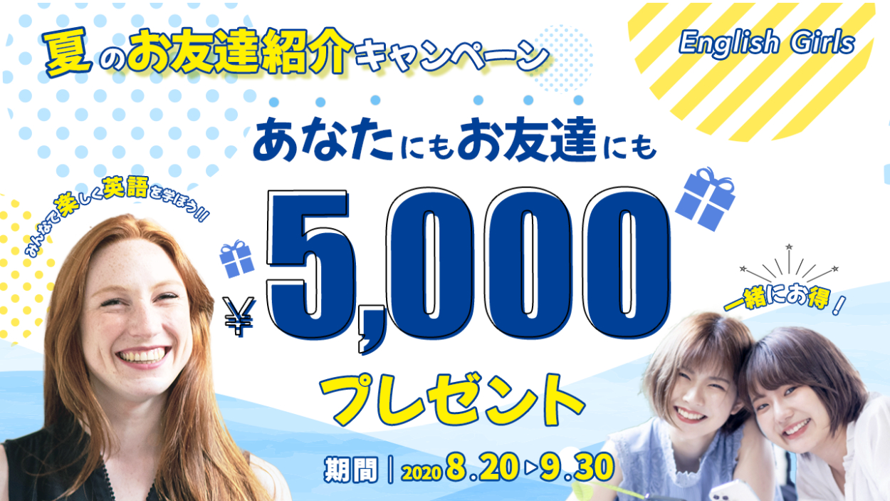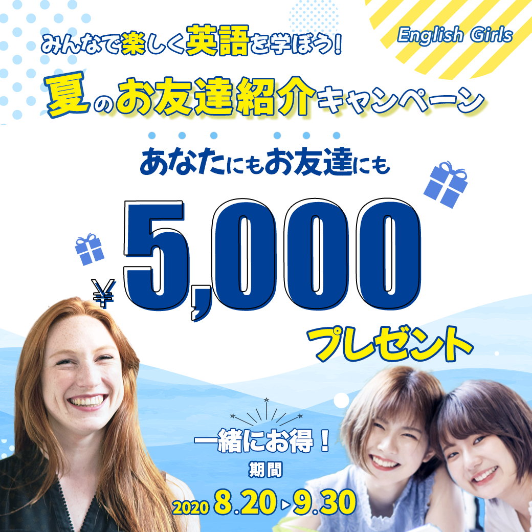 5,000円という掴みから、興味を持ってもらえるように中心に配置しました。次に何で5,000円がもらえるのかに注目するかを考え、英語を学ぶ、誰かと一緒に加入するということを強調することが大切であると考え、その後、期間限定であるということをアピールできるように夏と期間を強調することのできる配置にしました。