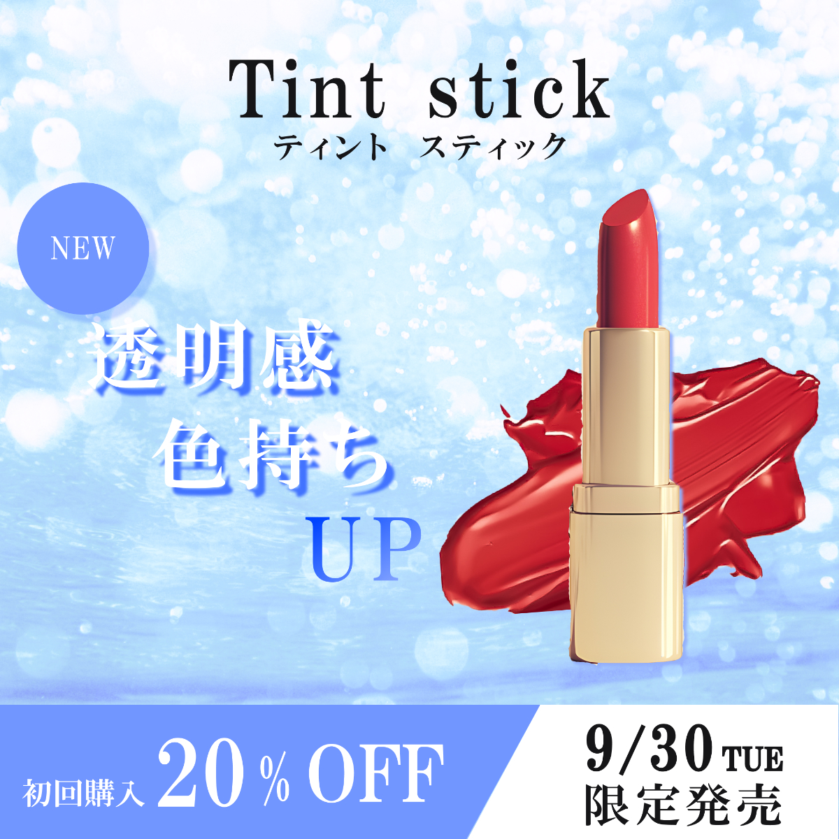 自主制作(2025.8) natsu Webデザインしたり、記事を書いたり 【コスメ新商品告知】制作時間1.5h/Figma1080*1080px/ECサイトTOPページ(新商品エリア)20~30代女性テキスト❶新発売!透明感UP❷数量限定リップティント❸初回購入20%OFF