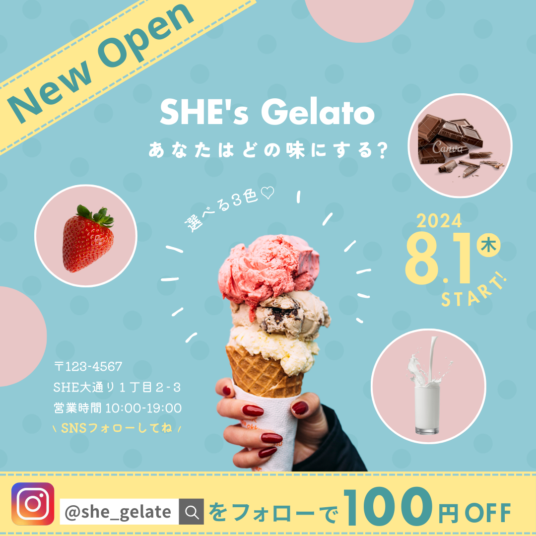 ・new open→店名→日付→店舗情報→Instagramをフォローで100円OFFの順で視線誘導