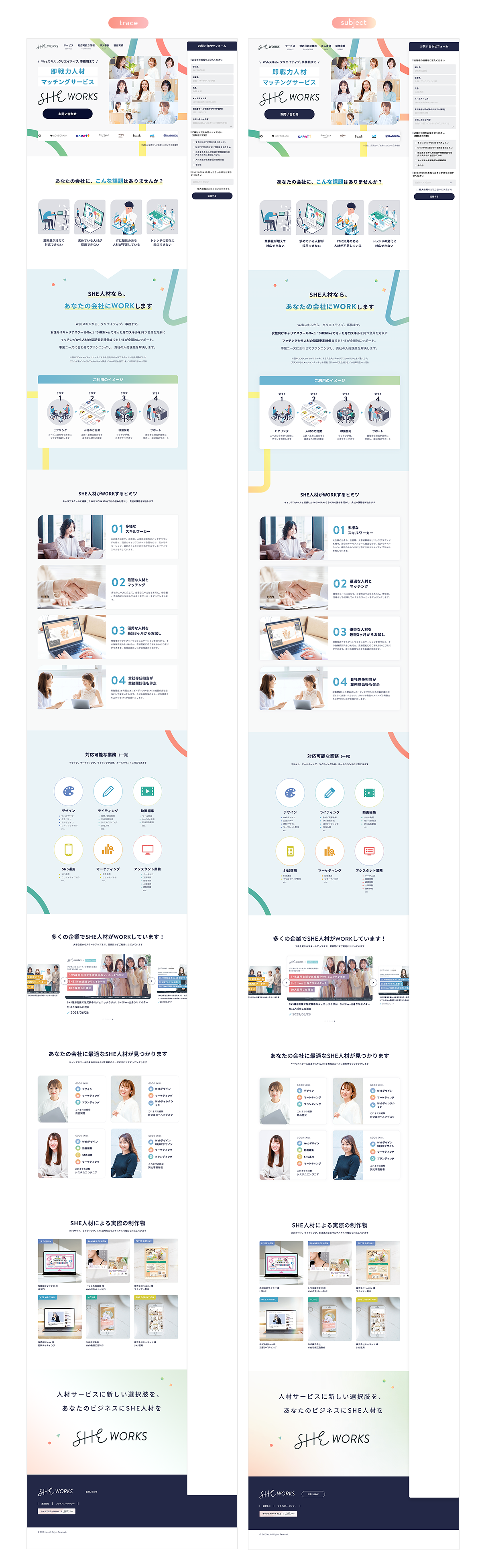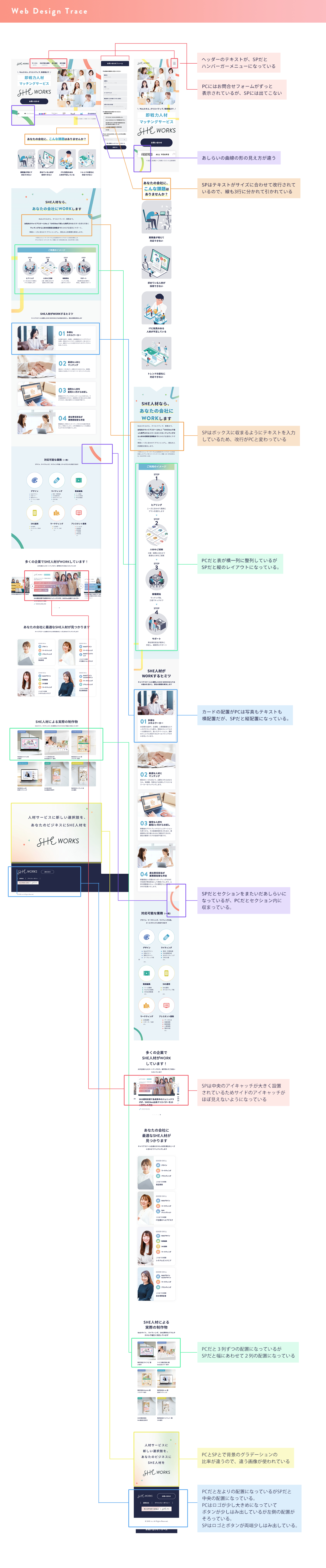 SHElikes MULTI CREATOR COURSEの課題で、SHEworksのLPトレースを行いました。 トレースの他に、スタイルガイドの作成やPCとスマートフォンの表示画面の相違点をまとめました。