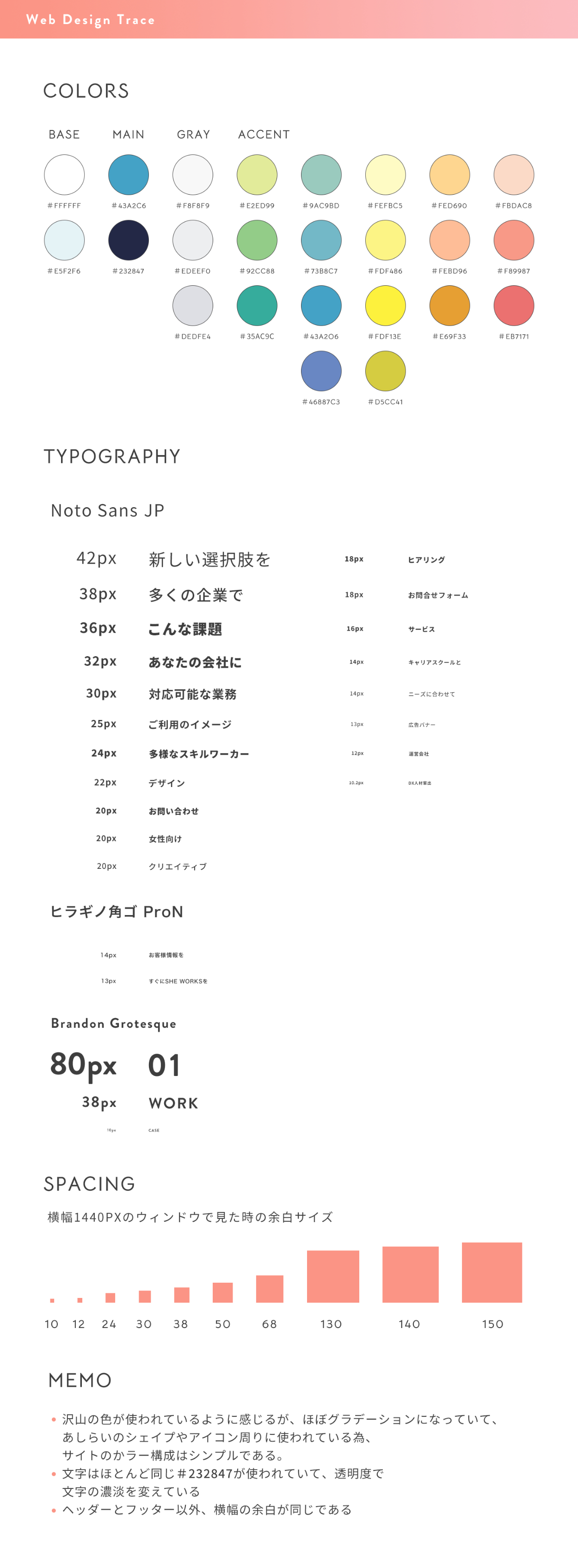 - 今回のトレースのサイトは、画像に使用されているカラーがグラデージョンになっていたのもあり、最初に見た時は、色数が多いサイトだと思っていましたが、分析すると、サイトの構成している色味は少なく、文字色の不透明度を調節して背景にしたり、強調の太字で使用したり、色味の表現方法のバリエーションを学ことができました。