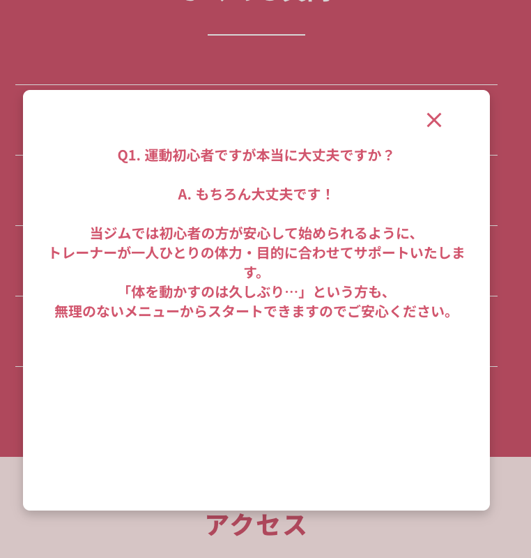Q&Aセクション:モーダル(ポップアップ)形式で表示し、読みやすくスッキリしたUIを実現
